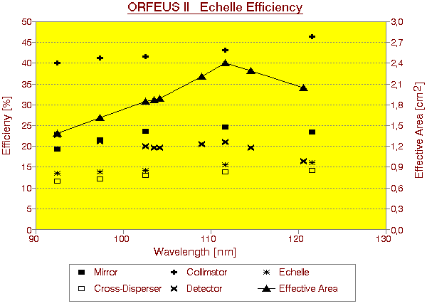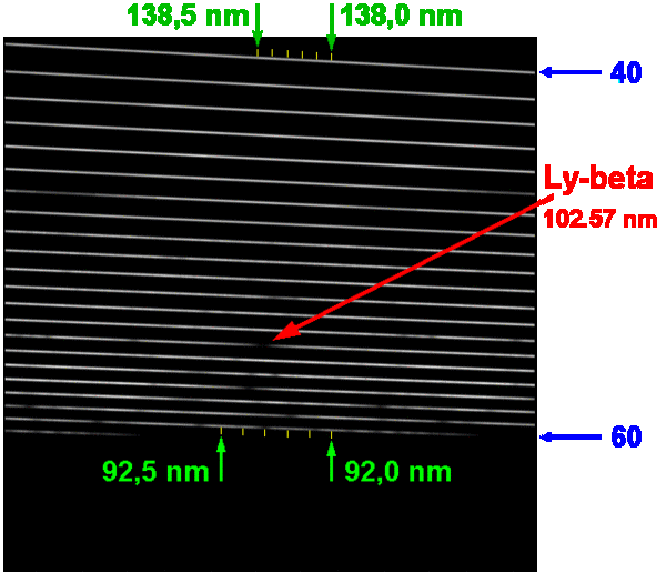 Die spektrale Auflösung des Echelle-Spektrometers beträgt 104, d.h. bei einer Wellenlänge von 100 nm können spektrale Einzelheiten von 0,01 nm aufgelöst werden. Das Echelle-Spektrum umfaßt einen Wellenlängenbereich von etwa 90nm bis 140nm, verteilt auf die Ordnungen 40 bis etwa 61.