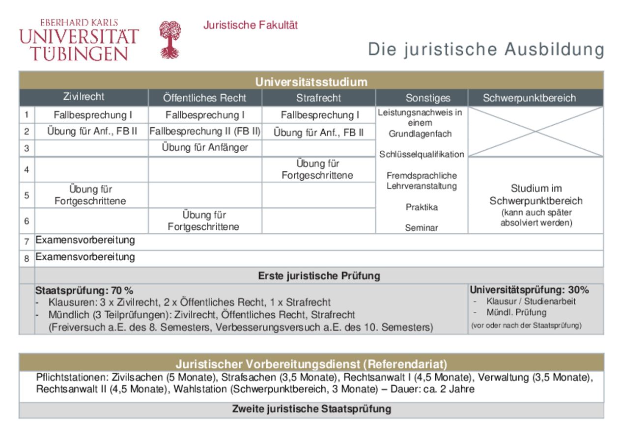 Den Abschluss Ihres Studiums im Pflichtfachbereich bildet die Staatsprüfung in der Ersten juristischen Prüfung. Dieser besteht aus sechs Klausuren (sog. "Aufsichtsarbeiten"), davon drei im Zivil-, eine im Straf- und zwei im Öffentlichen Rechts, sowie einer mündlichen Prüfung in allen drei dogmatischen Fächern. Die Staatsprüfung in der Ersten juristischen Prüfung wird baden-württembergweit und -einheitlich durch das Landesjustizprüfungsamt an den fünf Universitätsstandorten im Land abgenommen. Sie geht zu 70 Prozent in die Note in der Ersten juristischen Prüfung ein.