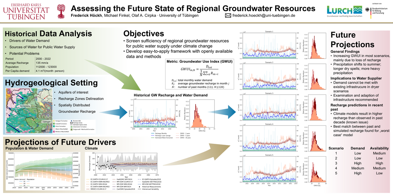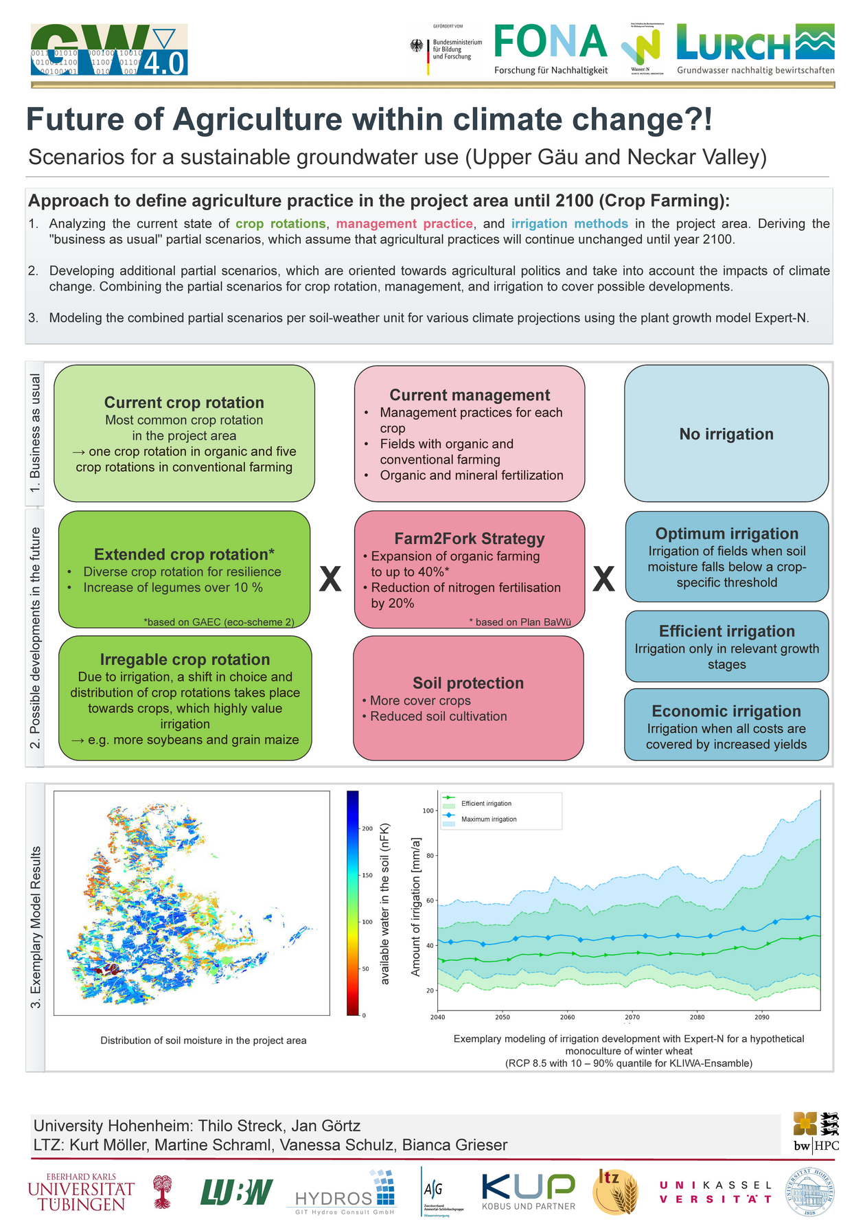 Im ersten Projektjahr werden – als Grundlage für die weiteren Arbeitsschritte und -pakete – Zukunftsszenarien entwickelt (nah bis 2050, fern bis 2100). Sie bilden mögliche bzw. erwartete Entwicklungen aller für die Wasserversorgung relevanter Parameter ab. Hydroklimatische Szenarien werden nach dem Stand der Technik abgeleitet (Starkniederschläge auf der Grundlage von KOSTRA-DWD-2010R, meteorologische Trockenheit nach dem KLIWA-Stresstest). Für Baden-Württemberg liegt ein KLIWA-Ensemble für RCP 8.5 vor, das mit geeigneten Projektionen auf Basis anderer Emissionsszenarien (z.B. RCP 2.6, ReKliEs) ergänzt werden wird. Die Ergebnisse laufender Projekte (z. B. BMBF-Fördermaßnahme “ClimXtreme”) werden bei Bedarf berücksichtigt. In den Landkreisen im Untersuchungsgebiet (TÜ, BB, untergeordnet HOR, CW) ist mit Bevölkerungswachstum, der Ansiedlung weiterer Betriebe und damit einem steigenden Wasserbedarf zu rechnen. Ergebnisse dazu liegen aus dem Masterplan Wasserwirtschaft Baden-Württemberg vor und fließen in die Wasserbedarfsszenarien ein. Geplante Veränderungen der Siedlungs- und Gewerbeflächen werden von den Kommunen und Regionalverbänden abgefragt. Mögliche Veränderungen der landwirtschaftlichen Nutzung (Fruchtfolge- und Düngungsstrategien, Beregnung) werden auf Basis von Versuchsergebnissen zur Bewässerungsbedürftigkeit ackerbaulicher Kulturen, der Erfahrungen der Landwirte und der zuständigen Verbände und Behörden (bspw. im Trockenjahr 2018) beschrieben, und fließen in die Berechnung von Bodenwasser- und Stickstoffhaushalt (AP2, AP3) ein. Ausgehend von den heutigen betrieblichen Rahmenbedingungen der Wasserversorger im Untersuchungsgebiet werden Szenarien möglicher Erweiterungen definiert. Über eine Auswertung historischer Betriebsdaten werden Zusammenhänge zwischen dem Auftreten qualitativer Probleme, den jeweiligen hydrologischen Verhältnissen und dem Betriebszustand identifiziert.