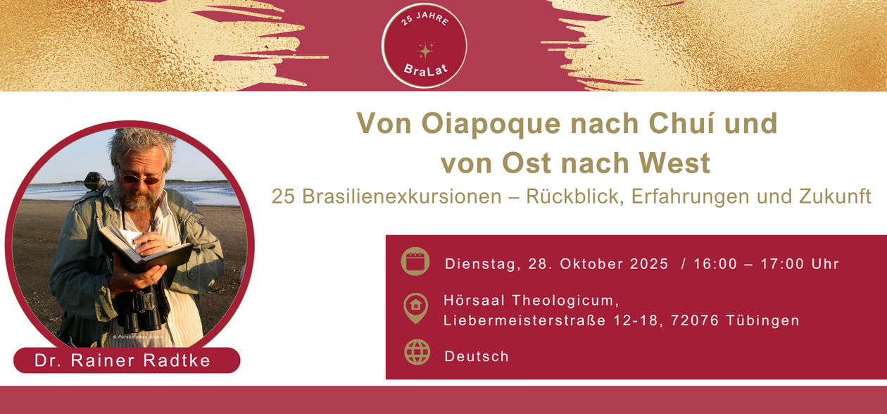Im Rahmen der Feierlichkeiten zum 25-jährigen Bestehen des BraLat (Baden-Württembergisches Brasilien- und Lateinamerika-Zentrum) hält Dr. Rainer Radtke den Vortrag „Von Oiapoque nach Chuí und von Ost nach West – 25 Brasilienexkursionen: Rückblick und Erfahrungen“.