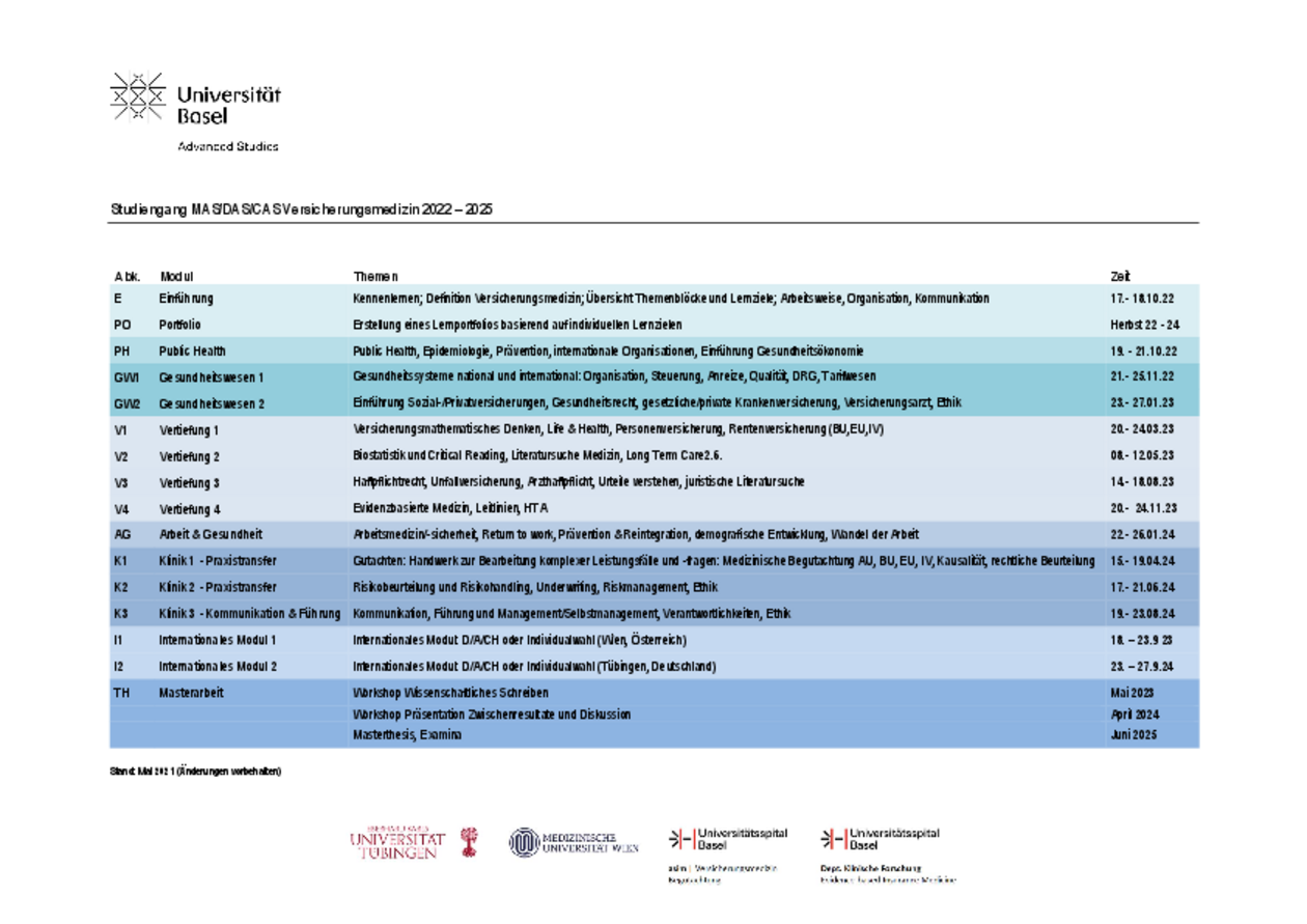 Der Zertifikatsstudiengang Master of Advanced Studies MAS in Versicherungsmedizin ist modular aufgebaut und umfasst 60 ECTS, die über 2 Jahre verteilt erworben werden können. Zusätzlich erstellen die Teilnehmenden über diesen Zeitraum ein Lern-Portfolio, basierend auf individuell gewählten und formulierten Lernzielen, welche die eigenen spezifischen Lerninteressen reflektieren und abdecken. Im dritten Jahr wird eine Masterarbeit verfasst, welche Themen aus den Tätigkeitsbereichen der Studierenden beinhalten kann.
