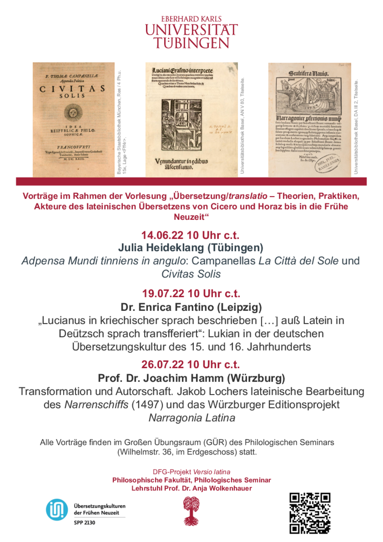 Im Rahmen der Vorlesung "Übersetzung/translatio - Theorien, Praktiken, Akteure des lateinischen Übersetzens von Cicero und Horaz bis in die Frühe Neuzeit" beleuchteten drei Vorträge anhand tiefergehender Fallstudien frühneuzeitliche Kontexte und Strategien des Übersetzens ins Lateinische näher.