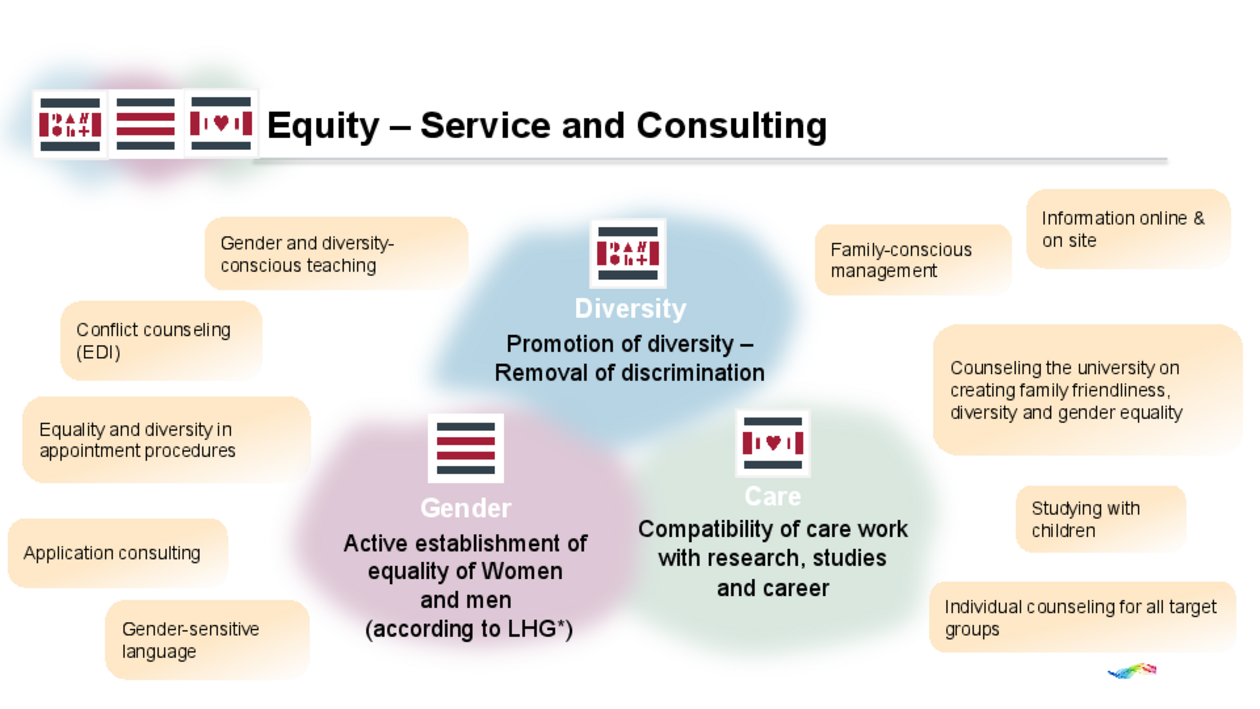 The Equal Opportunities Officer and her advisors in the area of gender, diversity and care offer advice on all issues relating to the cross-sectional mandate of equality, diversity and care. In addition to resolving specific concerns, the focus is on systematically identifying and addressing potentially discriminatory structures and on evidence-based approaches to improving equal opportunities. For example, HR managers in academic institutions and institutes receive advice on equal opportunities measures or structures or support in reflecting on bias - systematic cognitive errors that can lead to distortions in assessment and thus result in wrong decisions. University employees who would like to review structures or routines for discrimination risks in their area of responsibility can contact the Team Equity advisors for advice.