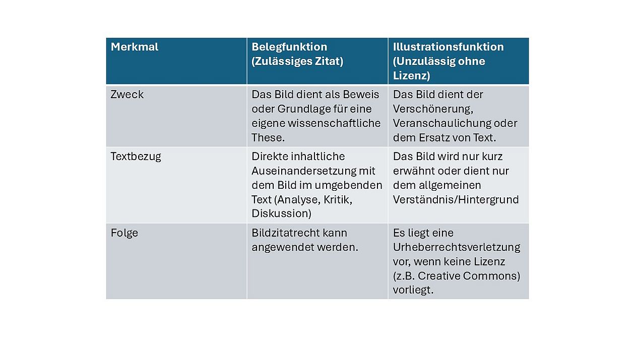 Yes, the right to quote images also applies to academic presentations, provided that they serve an academic purpose, such as internal colloquia or conference presentations. However, since text references to images are often shorter in presentations than in theses, the risk of mere illustration is higher. Make sure you discuss the content of each cited image in your presentation. Online publication of presentations: If the presentation is published online (e.g., on the institute's website or in a repository), exercise caution. Online publication has a wide reach and may impose stricter requirements on the permissibility of quotations. If you have any doubts, use licenses (CC0, CC BY, etc.) or your own work.
