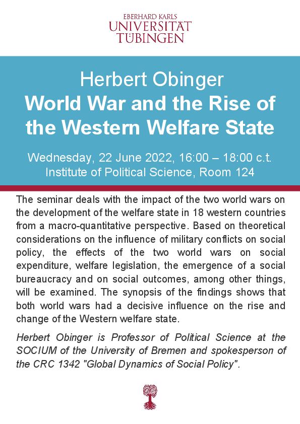 The seminardeals with the impact of the two world wars on the development of the welfare state in 18 western countries from a macro-quantitative perspective. Based on theoretical considerations on the influence of military conflicts on social policy, the effects of the two world wars on social expenditure, welfare legislation, the emergence of a social bureaucracy and on social outcomes, among other things, will be examined. The synopsis of the findings shows that both world wars had a decisive influence on the rise and change of the Western welfare state.