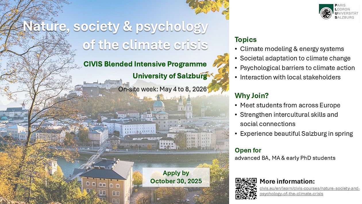 We are pleased to invite you to participate in the upcoming CIVIS Blended Intensive Programme (BIP) “Nature, Society and Psychology of the Climate Crisis”, hosted by the University of Salzburg from 4 to 8 May 2026.