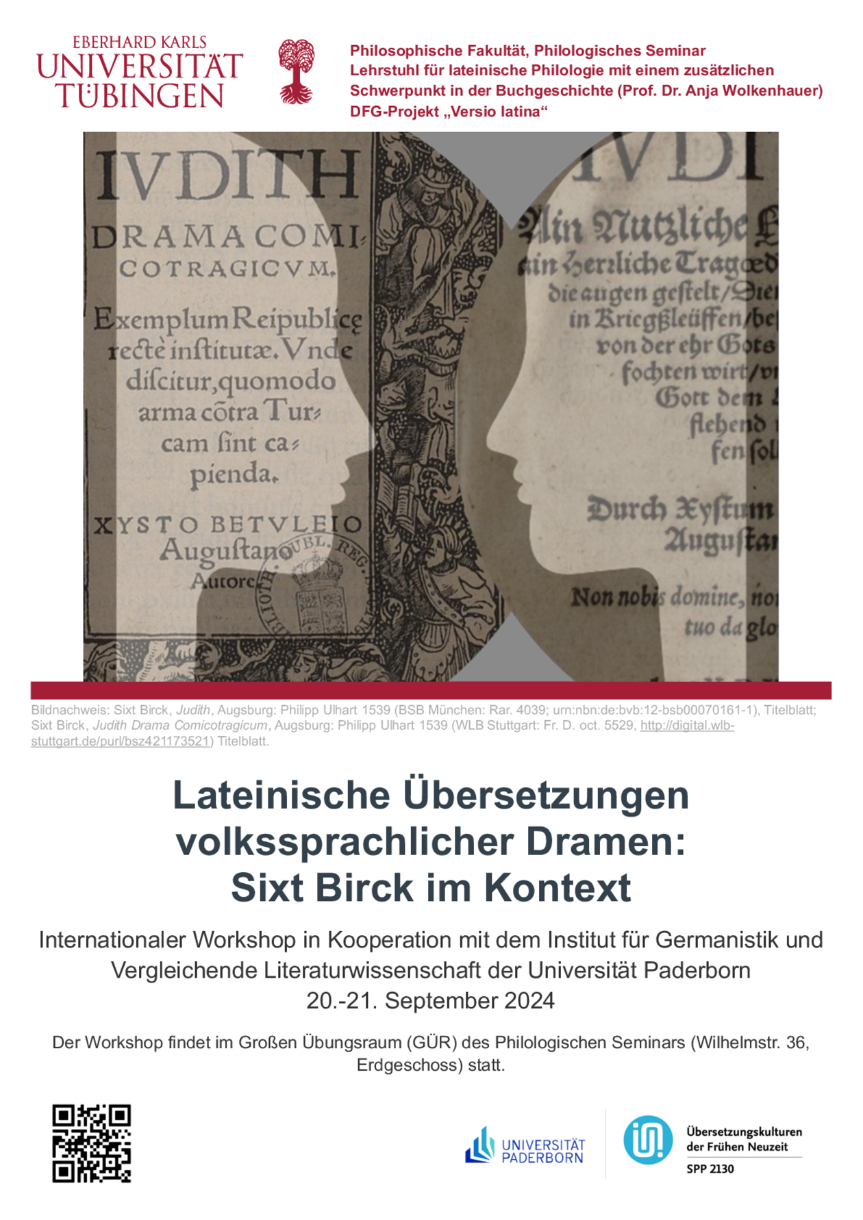 The international workshop "Latin Translations of Vernacular Dramas: Sixt Birck in Context" will be held from September 20 to 21 at the Classics Department of Eberhard Karls University, based on the collaboration of the DFG project “Versio latina” and Prof. Stefan Elit (Department for German Studies and Comparative Literature Studies, Paderborn). The workshop aims to present a collaborative platform for scholars to explore early modern vernacular drama and their translations, particularly Latin ones. Materials will be pre-circulated, read together, and discussed. A strong focus will be placed on the self-translations of Sixt Birck (Susanna 1532/1537 and Judith 1539/1539) presented by Stefan Elit and Julia Heideklang. Further confirmed experts are Caterina Blech (Fribourg), Dr. Giacomo Comiati (Padua), and Prof. Fernando Cioni (Florence).