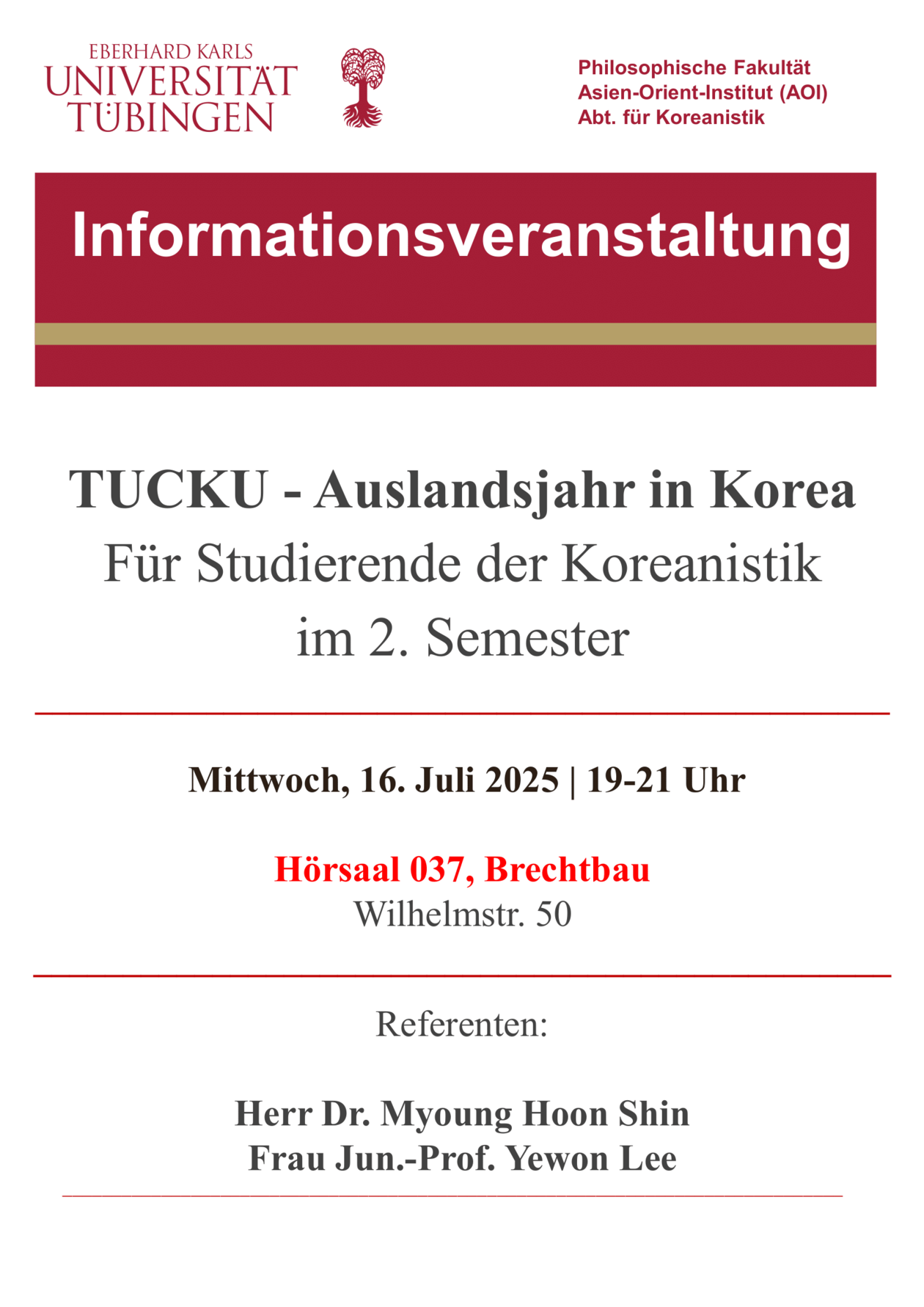 Zur akademischen Förderung von exzellenten Studierenden der Masterstudierenden in der Abteilung für Koreanistik, die für den Doppelmasterstudiengang MAKES mit der Seoul National University Tübingen nominiert worden sind, vergibt die Abteilung für Koreanistik jährlich ein Tübingen YWS Foundation Graduate Student’s Fellowship. Für das akademische Jahr 1. September 2025 bis 30. August 2026 (12 Monate) werden Bewerbungen entgegen genommen.