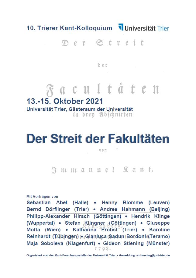As in previous years, the Kant Research Centre at the University of Trier will be holding the Trier Kant Colloquium. This time, the focus will be on the last piece Kant had published himself, "Der Streit der Fakultäten" ("The Dispute of the Faculties"), in which he attempts to clarify the relationship of the faculties in relation to each other, but above all the task and role of the philosophical faculty. In lectures on all three parts of this piece, its contents will be presented, contextualised and put up for discussion.
