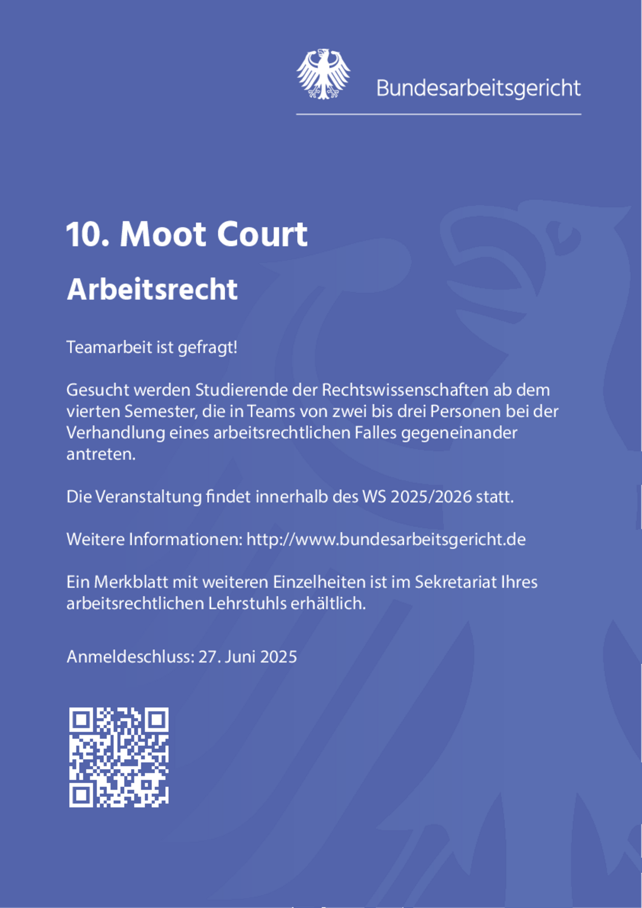 Das Bundesarbeitsgericht richtet alle zwei Jahre den arbeitsrechtlichen Moot Court in Erfurt aus. Der Moot Court ist Teil einer praxisnahen Ausbildung von Studierenden der Rechtswissenschaft. Er hat das Ziel, Rhetorik und freie Rede zu fördern und angehende Juristinnen und Juristen mit Anforderungen des beruflichen Alltags vertraut zu machen.