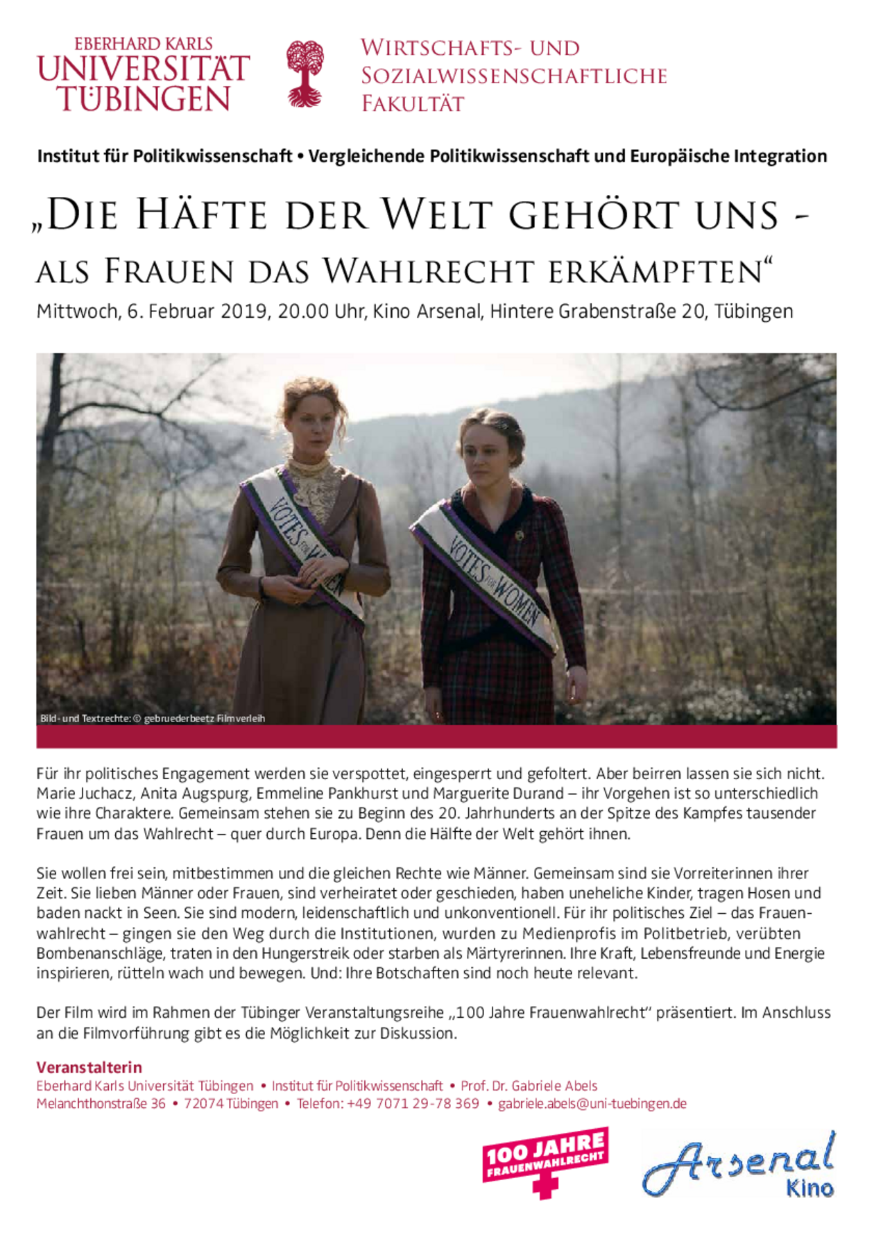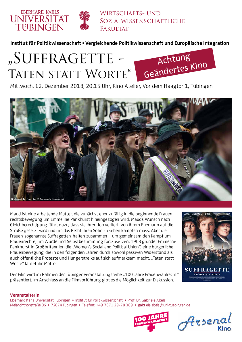 Im November 1918 erhielten Frauen in Deutschland endlich das Wahlrecht. Anlässlich dieses Jubiläums werden in Tübinger Kinos Spielfilme gezeigt, die den langen Kampf um das Frauenwahlrecht sowie das Leben der Frauenstimmrechtlerinnen in verschieden Ländern thematisieren.