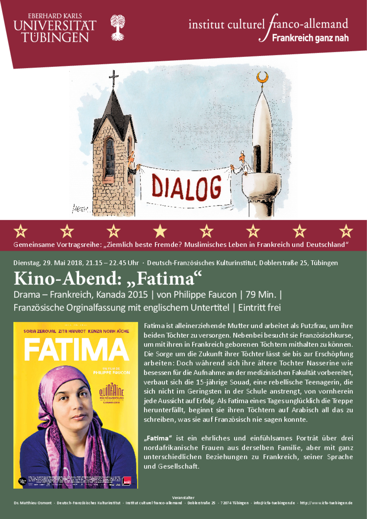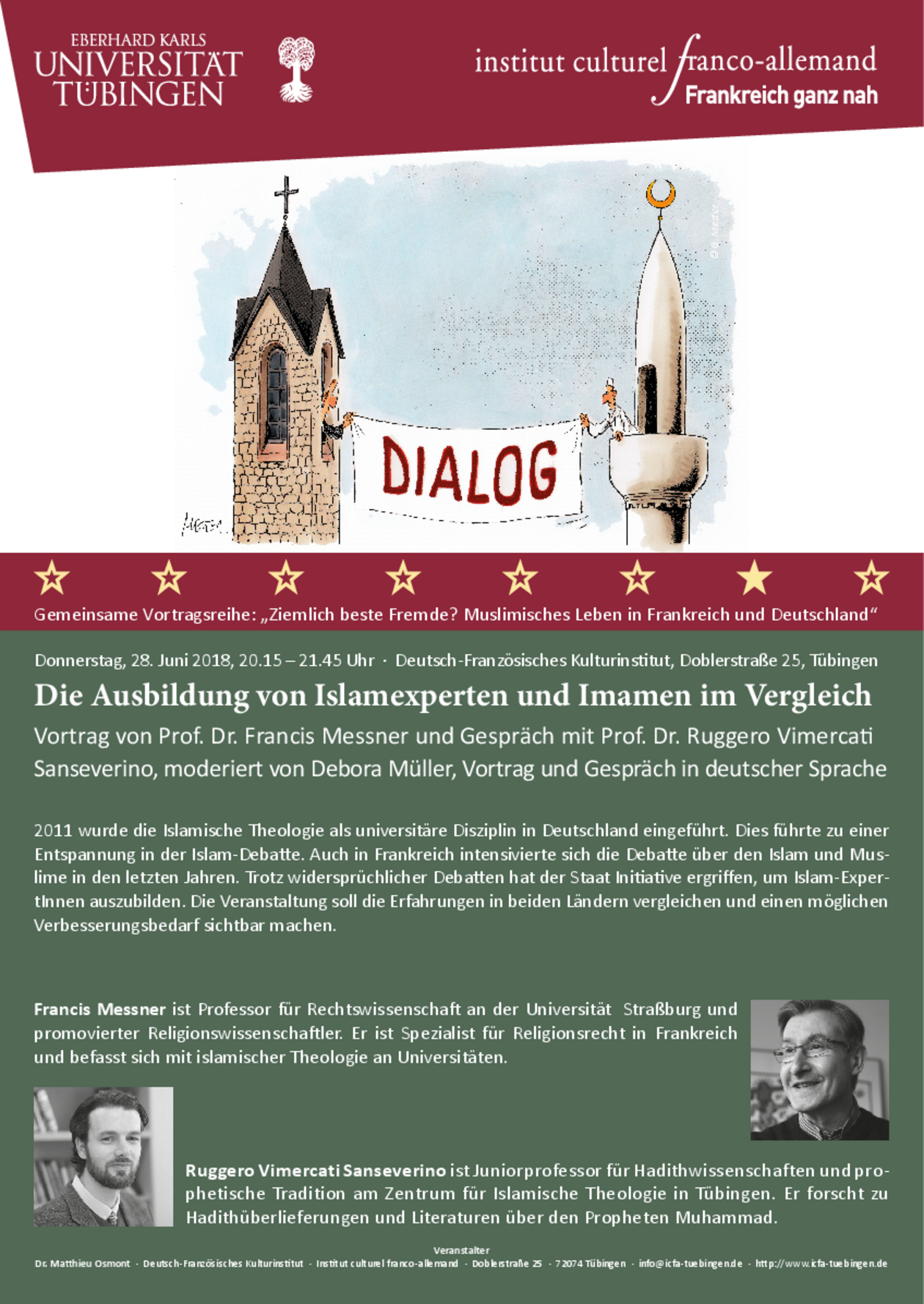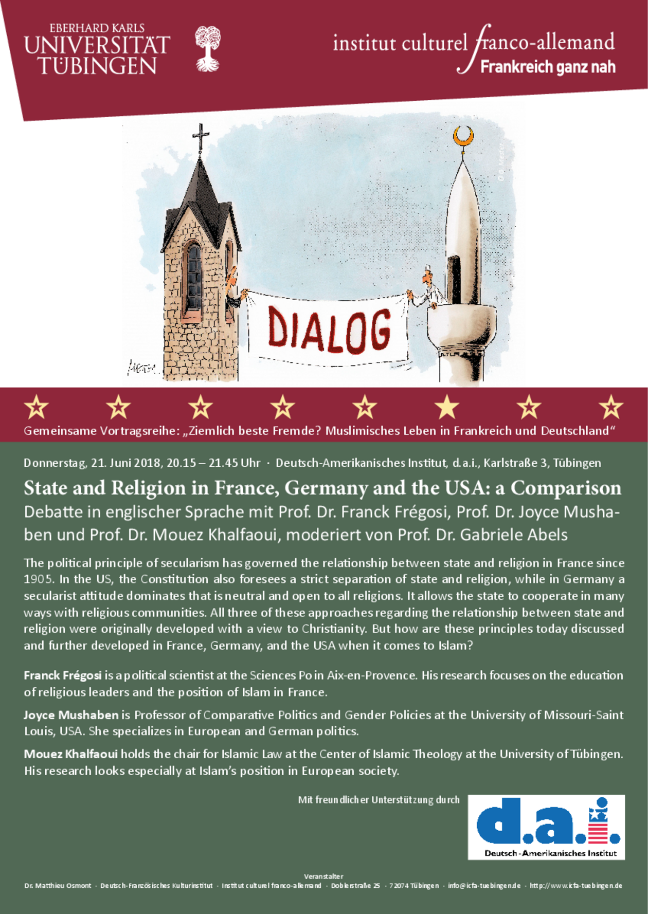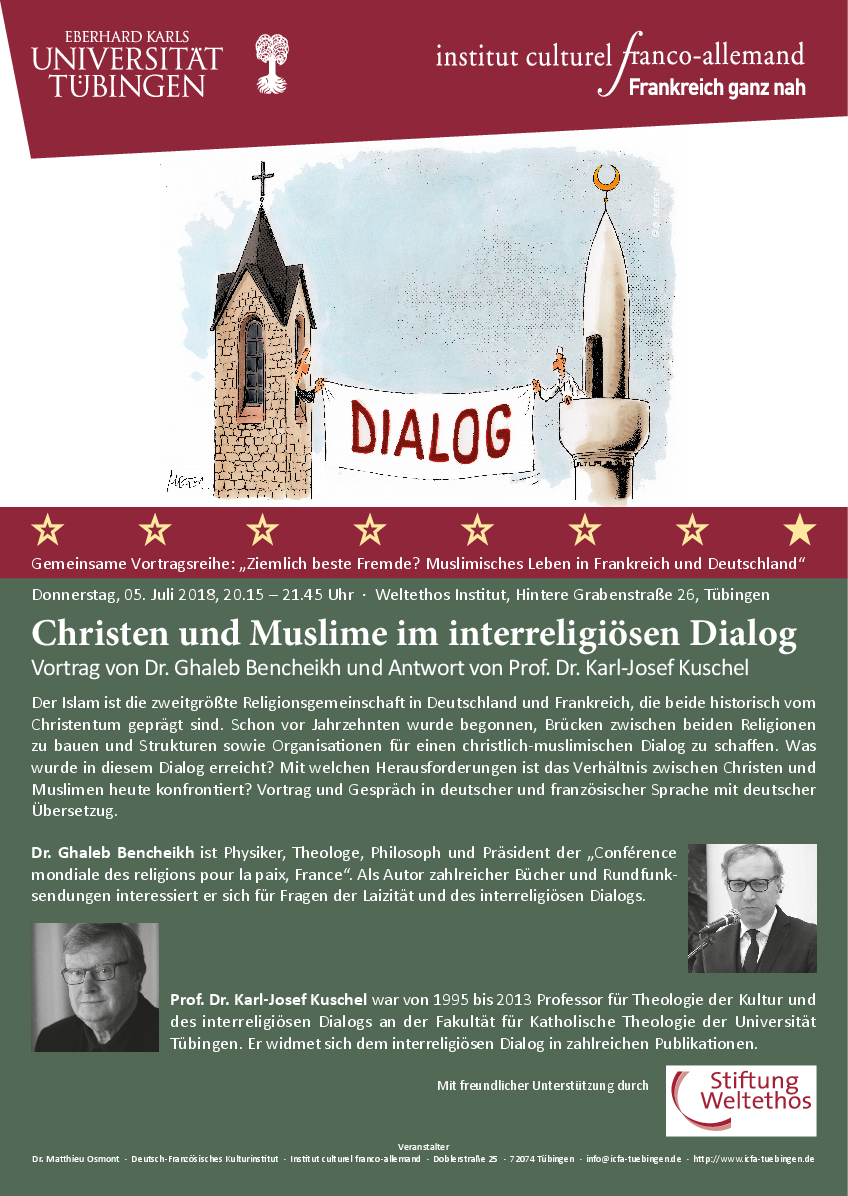Die Veranstaltungsreihe wird vom Deutsch-Französischen Kulturinstitut Tübingen e.V. in Kooperation mit dem Zentrum für Islamische Theologie, dem Institut für Politikwissenschaft , dem Weltethos-Institut und der Stiftung Weltethos sowie dem Deutsch-Amerikanischen Institut Tübingen organisiert und veranstaltet.