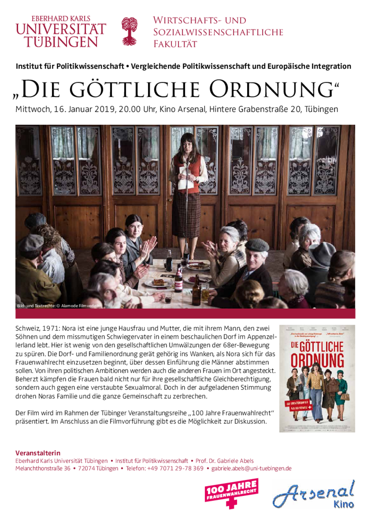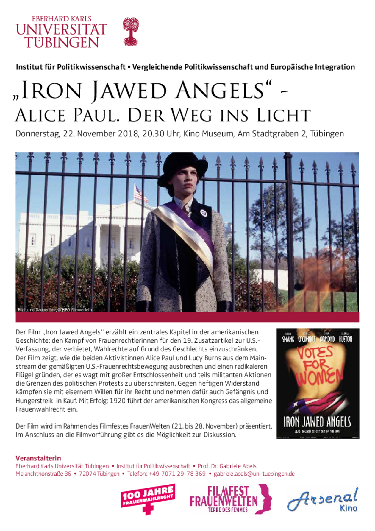 Die Filmreihe startet im Rahmen des Filmfestes FrauenWelten (21. bis 28. November) mit dem Film „Iron Jawed Angels – Alice Paul. Der Weg ins Licht“. Es folgen die Spielfilme „Suffragette – Taten statt Worte“, „Die göttliche Ordnung“ und das Doku-Drama „Die Hälfte der Welt gehört uns – als Frauen das Wahlrecht erkämpften“. Im Anschluss an die Filmvorführungen gibt es jeweils die Möglichkeit zur Diskussion.
