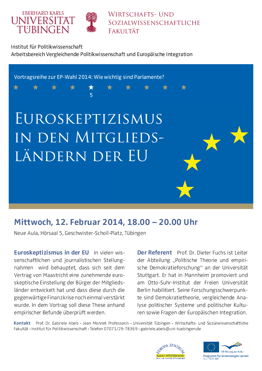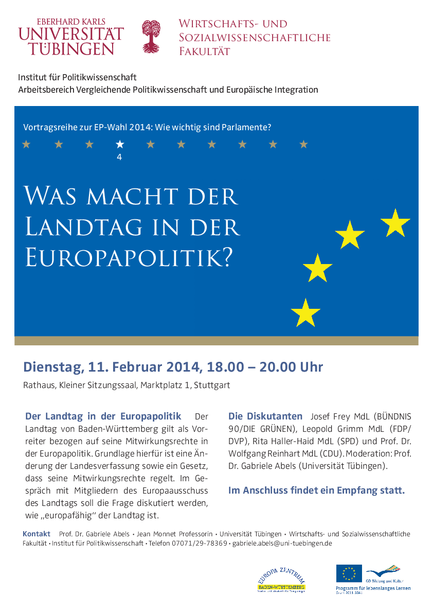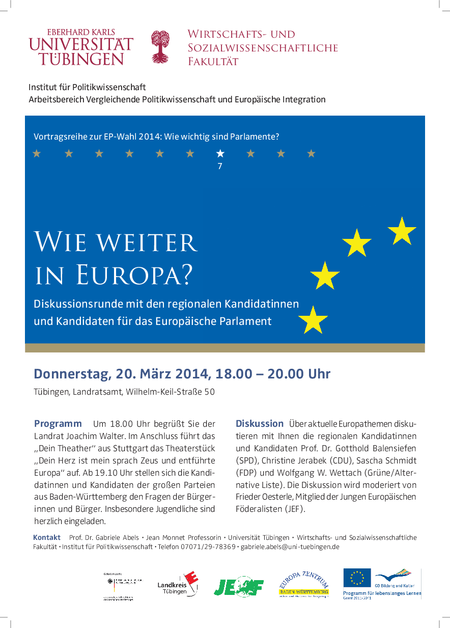 Each lecture by recognised international experts discusses particular aspects of this overarching question. In addition, EU politicians and EU politicians of the Landtag as well as the European parliament are facing the questions posed by citizens. The events are taking place in Stuttgart, Ludwigsburg, Reutlingen und Tübingen.