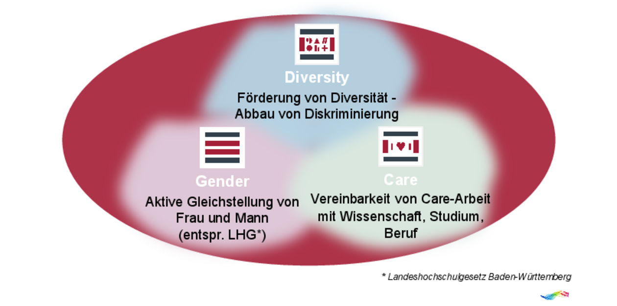 Um Synergien für die Erreichung dieser Ziele zu nutzen, werden die Themenbereiche Gender, Diversity und Care nicht getrennt bearbeitet. So werden Gemeinsamkeiten und auch mögliche Konfliktlinien identifiziert. Vor allem aber werden die Ziele intersektional verfolgt: Insbesondere das Geschlecht ist verwoben mit allen anderen Merkmalen der Vielfalt - diverse Faktoren summieren sich nicht, sondern lassen spezifische Formen von Mehrfachdiskriminierung oder Lebenswirklichkeit entstehen.