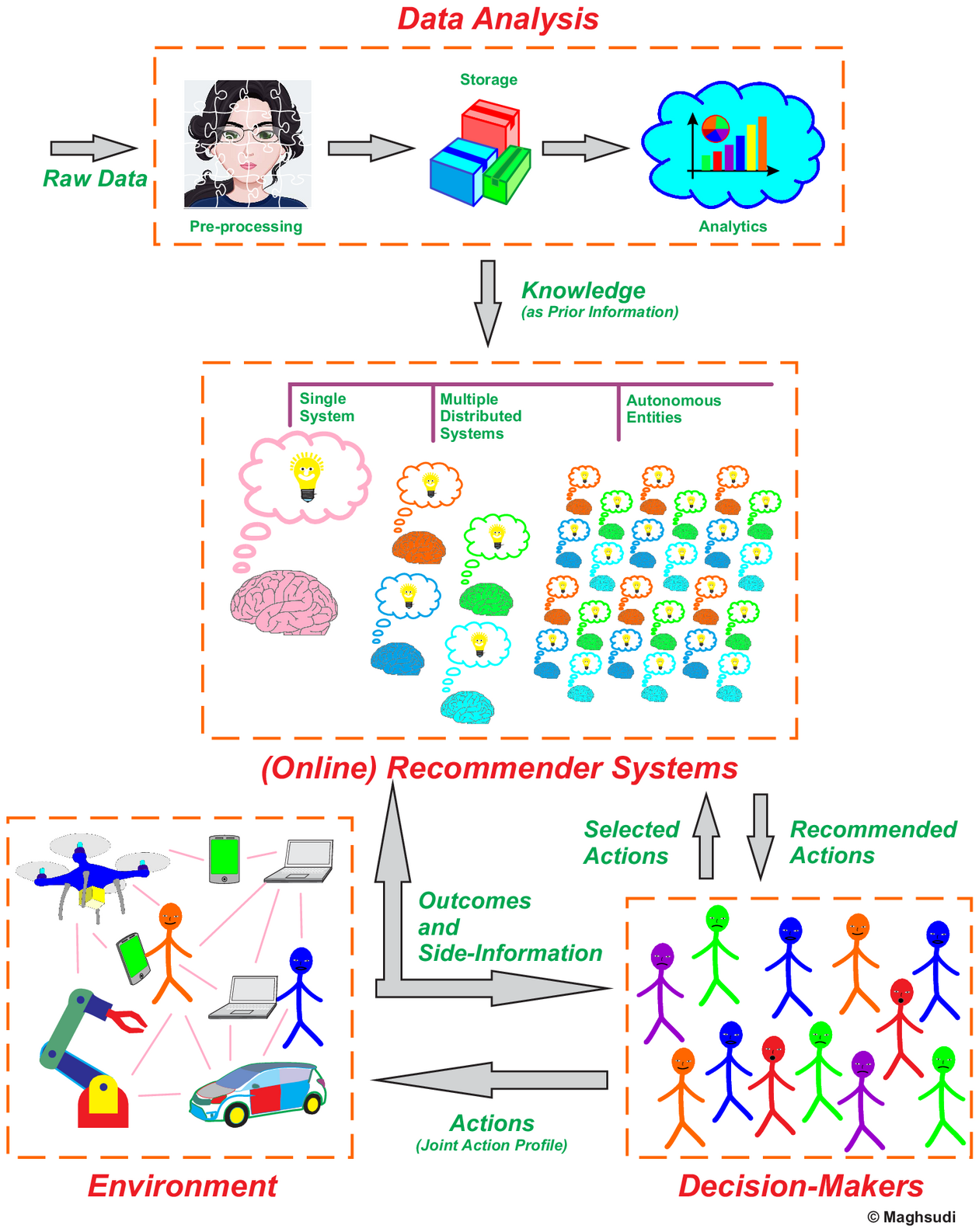 - Interaction and Playing Games under Uncertainty: The aforementioned challenges can be extended to the multi-agent setting. In essence, in many real-world problems, a number of entities affect each other by their decisions, while being uncertain about each other’s characteristics, including abilities and preferences. Moreover, the environment can have some random and a priori unknown state, on which the agents and their decisions depend. Therefore, the agents engage in interactions with each other and with the environment, to learn the environment and the way they impact the utility of each other. Through learning, the agents shall come up with some decisionmaking strategy whose outcome is some sort of efficient equilibrium. Multi-agent reinforcement learning, mechanism design under uncertainty, persuasion, and similar problems fall into this category.