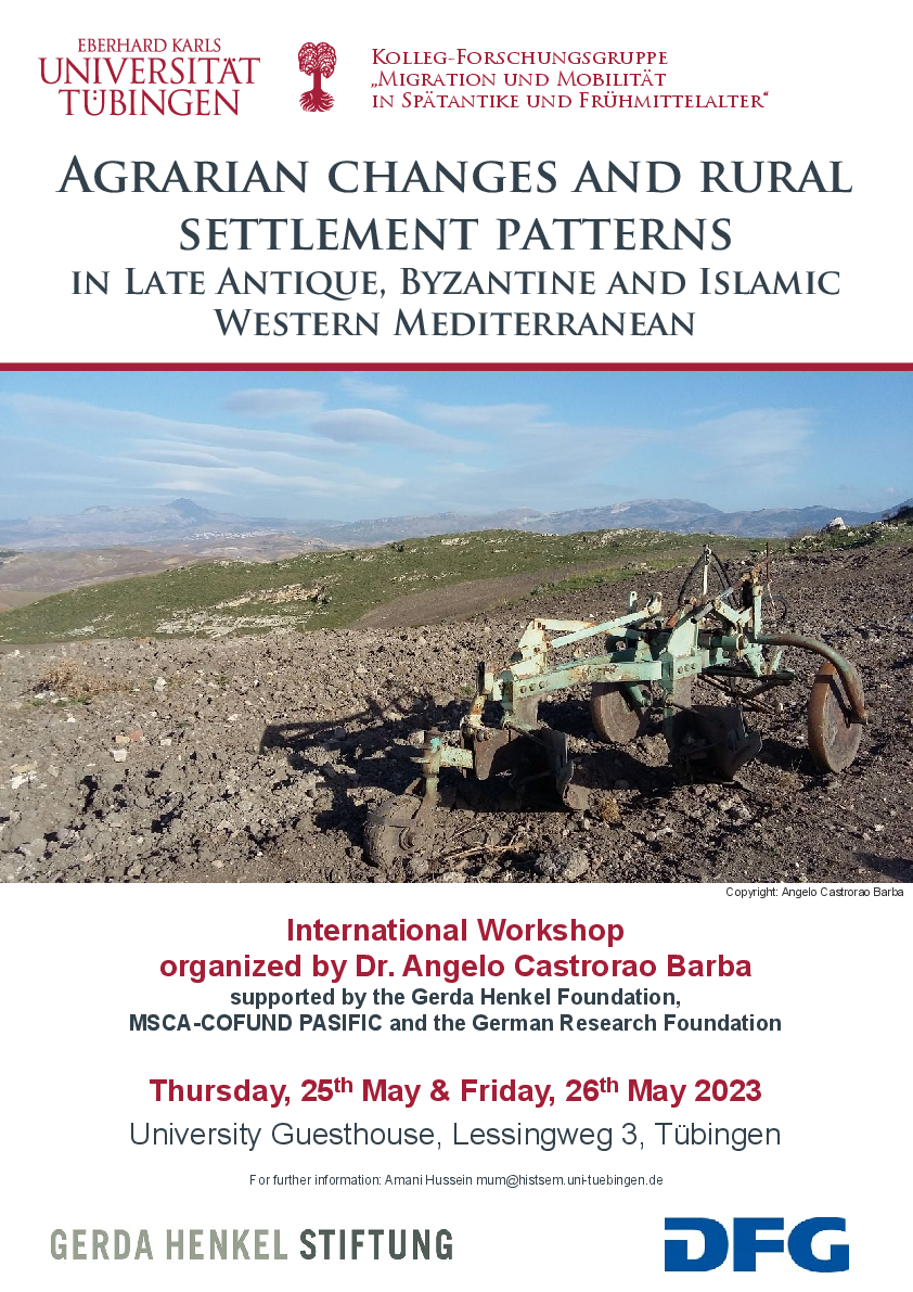 On 25th and 26th of May, our former fellow Angelo Castrorao Barba (IAE-PAS) holds a conference on "Agrarian changes and rural settlement patterns in Late Antique, Byzantine and Islamic Western Mediterranean". The conference location will be the guesthouse in Lessingweg 3, 72076 Tübingen.
