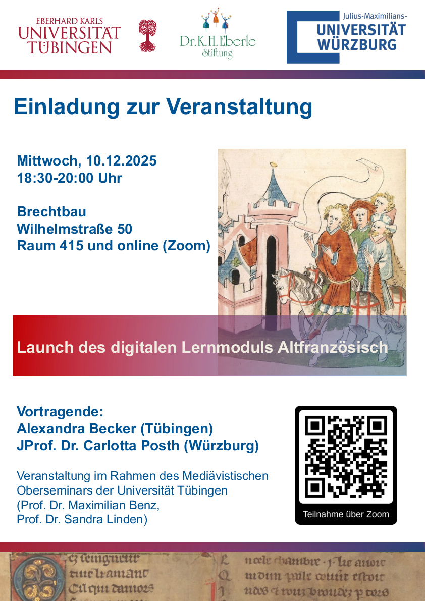 Wir möchten Sie herzlich zum Launch des Lernmoduls Altfranzösisch am 10.12.2025 um 18:30 Uhr im Rahmen des Mediävistischen Oberseminars der Universität Tübingen einladen. Die Veranstaltung wird in Präsenz (Brechtbau, Wilhelmstraße 50, Raum 415) und digital stattfinden.