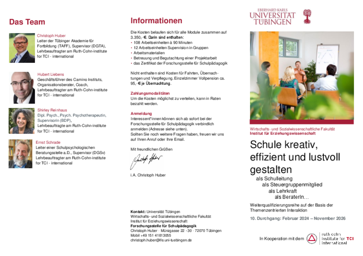 Neben der Gestaltung und Moderation von pädagogischen Tagen bietet die Tübinger Akademie für Fortbildung (TAFF) unterschiedlichste Weiterbildungs- und Weiterqualifizierungsangebote für Kollegien, Teams, Steuergruppen und Führungskräfte an.