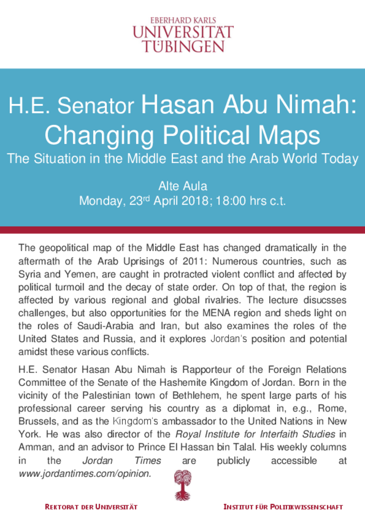 Nach den Ereignissen des Arabischen Frühlings hat sich vieles verändert in der Region. Hasan Abu Nimah gab Einblicke in die Länder des Nahen Ostens. Außerdem ging er auf die Rolle, die Saudi-Arabien, Iran aber auch Russland und die USA in den verschiedenen Konflikten spielen, ein. Viele Interessierte besuchten den Gastvortrag in der Alten Aula.
