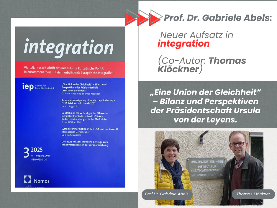 In der aktuellen Ausgabe der wissenschaftlichen Zeitschrift integration (3/2025) präsentiert Prof. Dr. Gabriele Abels, Sprecherin des EZFF (Europäisches Zentrum für Föderalismus-Forschung Tübingen) und Professorin am Institut für Politikwissenschaft (Lehrstuhl für Vergleichende Politikwissenschaft und Europäische Integration), den Aufsatz: