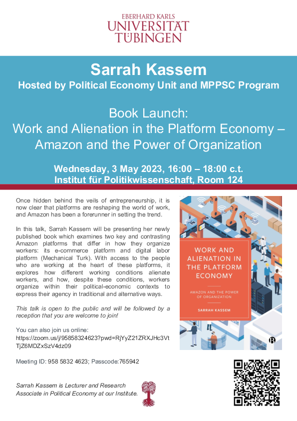 In this talk, Sarrah Kassem will be presenting her newly published book which examines two key and contrasting Amazon platforms that differ in how they organize workers: its e-commerce platform and digital labor platform (Mechanical Turk). With access to the people who are working at the heart of these platforms, it explores how different working conditions alienate workers, and how, despite these conditions, workers organize within their political-economic contexts to express their agency in traditional and alternative ways.