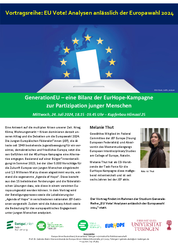 Melanie Thut, am Mittwoch, den 24. Juli, 18-20 Uhr c.t., Hörsaal 25 im Kupferbau, im Rahmen der Studium Generale-Reihe "EU Vote! Analysen anlässlich der Europawahl 2024"