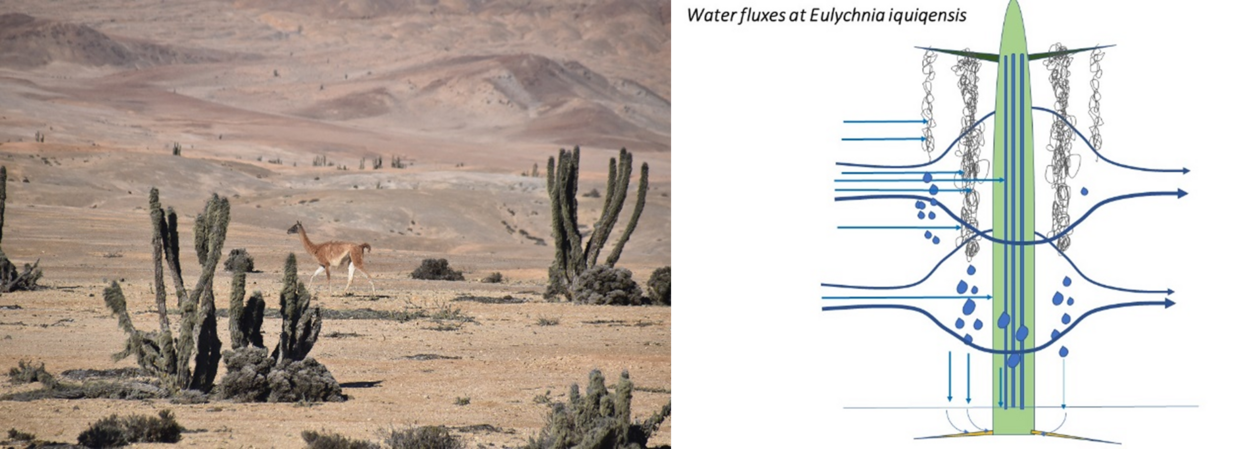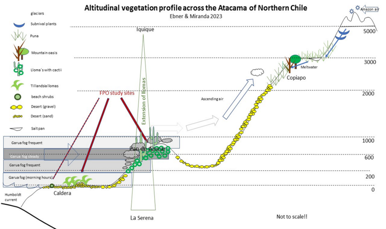 A study site representative for the situation in the transition between semiarid and hyperarid section of the Coastal cordillera in the Northern Atacama is the National Parc Pan the Azúcar. A steep escarpment arises from the coastline to an altitude of 700 m. From there a 15 km plateau slightly descends towards the continent cut by a riverbed which brings meltwater from the high Andes to the coast. The escarpment line is affected by fog originating from clouds rising at the coastal slopes.