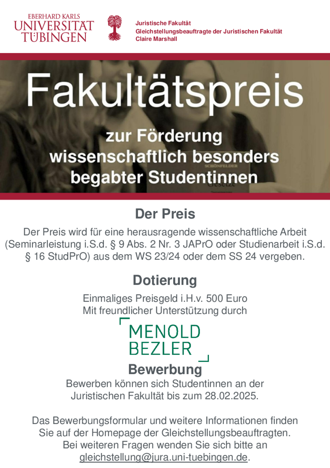 Bewerberinnen reichen ihre Bewerbungsunterlagen bis zum 28.02.2025 per Mail an gleichstellungspam prevention@jura.uni-tuebingen.de ein.