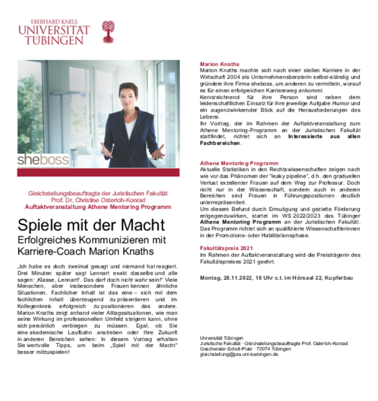 Der Vortrag richtet sich an Interessierte aus allen Fachbereichen. Er findet im Rahmen der Auftaktveranstaltung für das Athene Mentoring Programm für qualifizierte Nachwuchs-wissenschaftlerinnen an der Juristischen Fakultät statt, das im WS 2022/2023 startet.