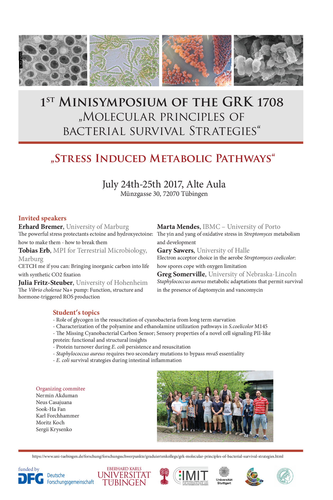 The first Minisymposium organized by the GRK1708 will take place in the Alte Aula of the University of Tübingen between July 24-25, 2017 and will focus on "Stress Induced Metabolic Pathways".