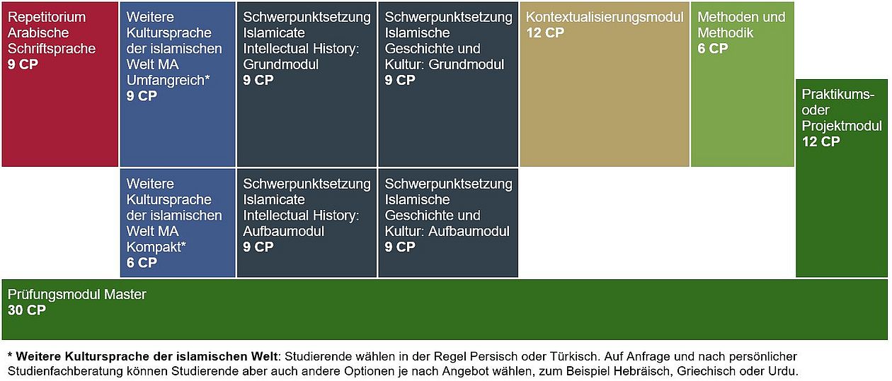 | ISL-MA-11 | Prüfungsmodul | Schriftliche Masterarbeit | 20 CP (benotet) | Sie verfassen eine wissenschaftliche Arbeit im Umfang von ca. 60-80 Seiten (18.000-24.000 Wörtern) zu einem ausgewählten Thema nach Absprache innerhalb einer Bearbeitungsfrist von 4 Monaten. In der mündlichen Prüfung (45 Minuten) verteidigen Sie Ihre Masterarbeit und werden in einem zusätzlichen Thema nach Absprache sowie in Arabisch geprüft. |
