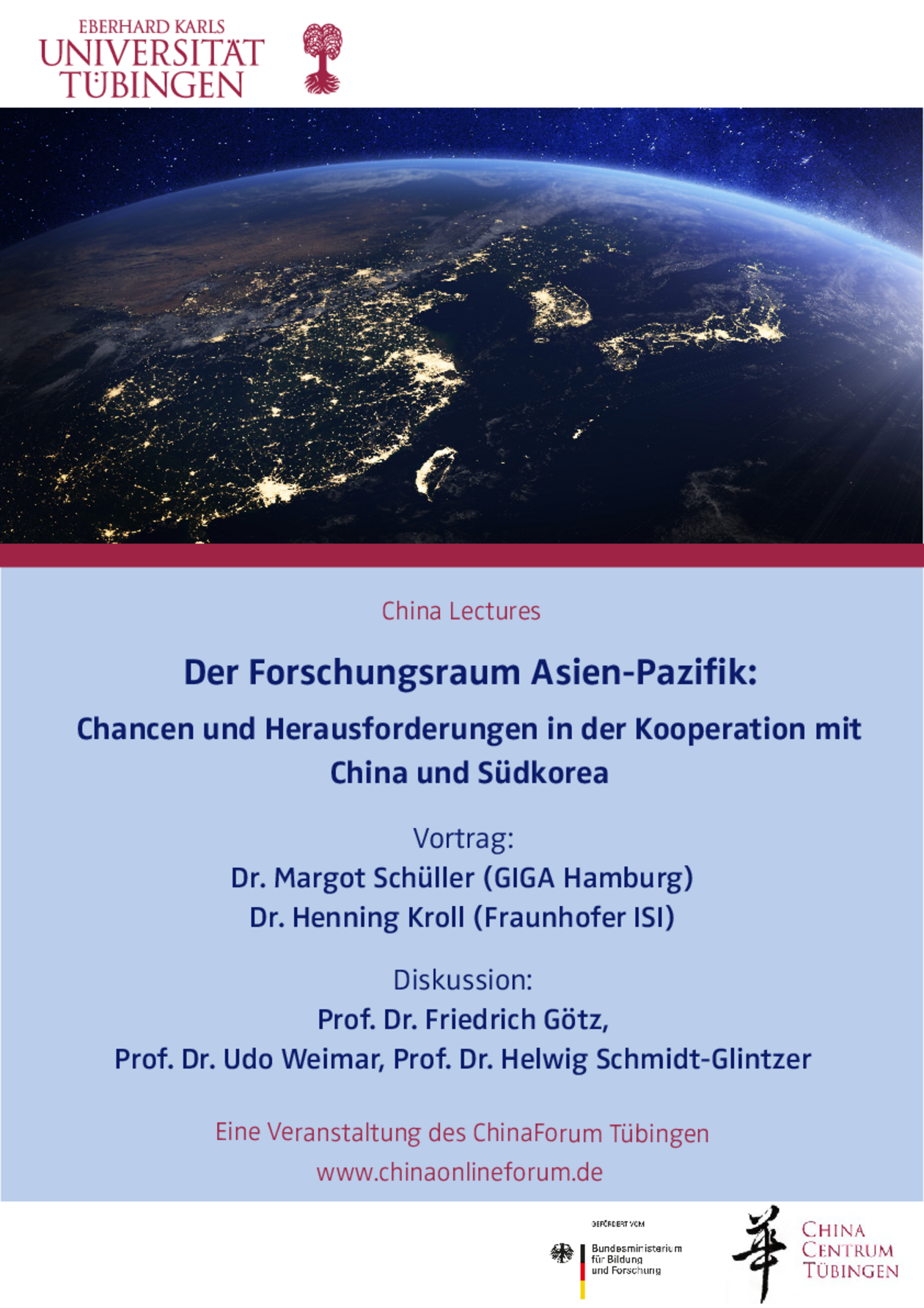 Im Licht des Vortrags diskutieren anschließend Forscher der Universität Tübingen ihre langjährigen Kooperationserfahrungen mit China sowie Chancen und Herausforderungen bei der zukünftigen Zusammenarbeit. Im Panel diskutieren Prof. em. Dr. Friedrich Götz (Mikrobielle Genetik), Prof. Dr. Udo Weimar (Phys. u. Theoret. Chemie), Prof. Dr. Helwig Schmidt-Glintzer (Sinologie).