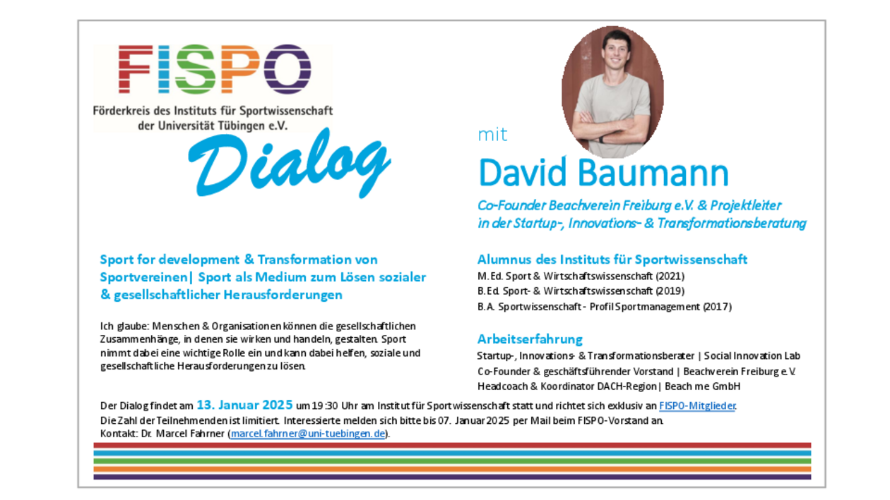 Um interessierten Mitgliedern untereinander einen dialogischen Austausch zu ermöglichen, organisiert FISPO in unregelmäßigen Abständen niederschwellige Gespräche. Diese Dialoge sollen insbesondere mit Alumni der Tübinger Studiengänge geführt werden, wobei die berufstätigen Absolventinnen und Absolventen über ihre aktuelle berufliche Tätigkeit, ihr Berufsfeld und ihren bisherigen Karriereweg informieren, sowie rückblickend ihr Studium am Tübinger Institut reflektieren.
