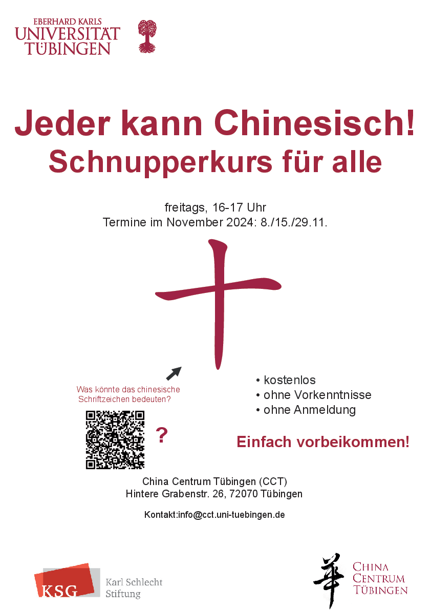 Interessieren Sie sich für die chinesische Sprache? Dann kommen Sie zu unserem kostenlosen Schnupperkurs! Hier haben Sie die Möglichkeit, erste Einblicke zu gewinnen und Erfahrungen zu machen – ganz ohne Vorkenntnisse. Der monatliche Schnupperkurs findet freitags von 16-17 Uhr am China Centrum Tübingen statt. In den ersten drei Sitzungen (08./15./29. November) befassen wir uns mit dem Aufbau und der Struktur der chinesischen Schrift und üben einfache Alltagswendungen. Neben praktischen Sprachübungen werden auch kulturspezifische Themen in den Blick genommen, so dass Sie Chinas SprachWelt besser verstehen lernen.