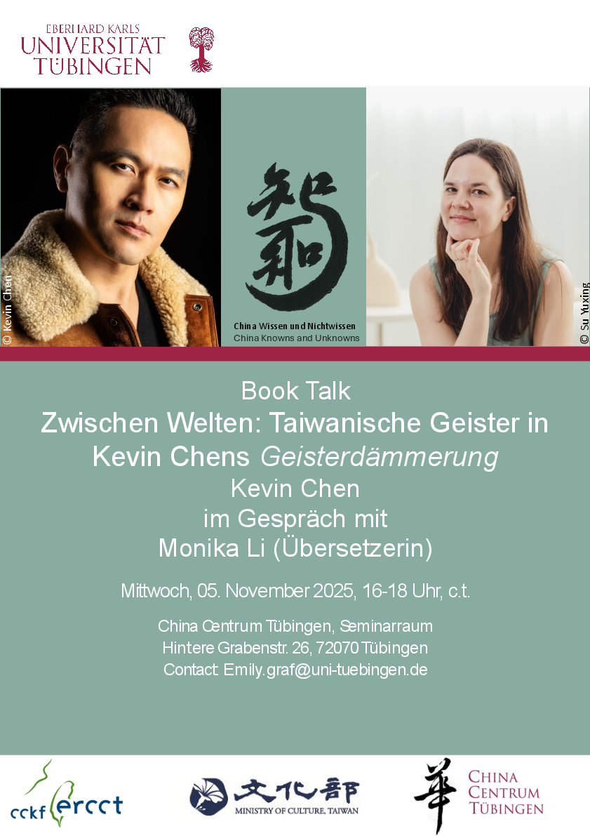 In cooperation with the European Research Center on Contemporary Taiwan, the CCT warmly welcomes everyone to a book launch and conversation with Taiwanese author Kevin Chen and translator Monika Li. They will introduce Chen’s novel Ghost Town (2019) and Li’s forthcoming 2025 German translation, Geisterdämmerung. The talk will be in German.