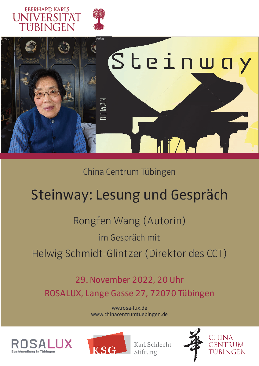 Anlässlich des Erscheinens ihres neuen Romans "Steinway" kommt die Autorin Rongfen WANG am 29. November 2022 ab 20 Uhr in die Buchhandlung ROSALUX (Lange Gasse 27, 72070 Tübingen). Udo Rau (Schauspieler) liest Auszüge aus dem teils autobiographischen Roman über die chinesische Kulturrevolution. Im anschließenden Gespräch mit Helwig Schmidt-Glintzer (Direktor des CCT) spricht die chinesische Autorin über die Bezüge der politischen Entwicklung der Volksrepublik China zu Ihren persönlichen Erfahrungen.