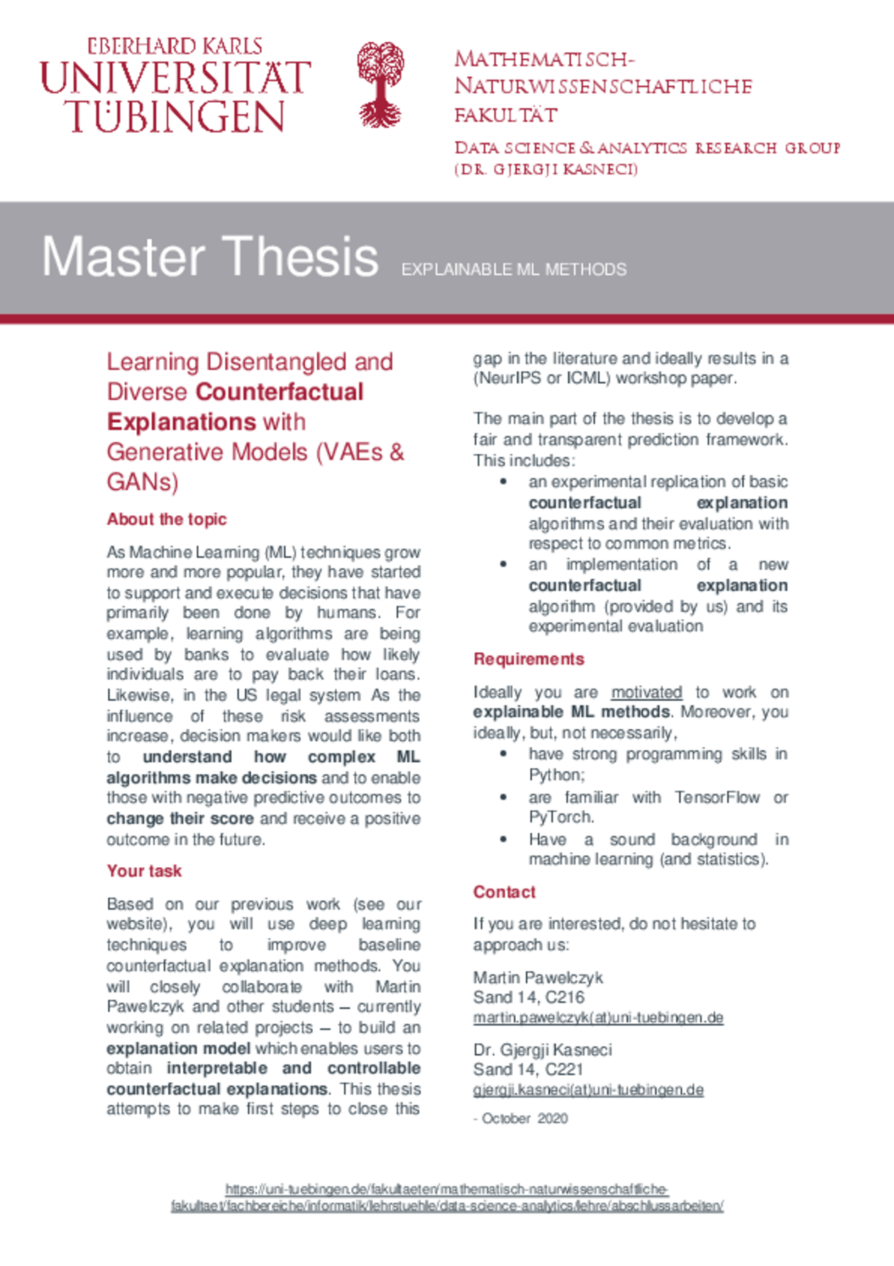We are pleased to announce two open Master's theses about "Learning Disentangled and Diverse Counterfactual Explanations with Generative Models"  and "Counterfactual Explanations in Causal ML Models" (more information as PDF-download here and here). Open questions and applications (including a CV and the current transcript of records) can be sent to Martin Pawelczyk.
