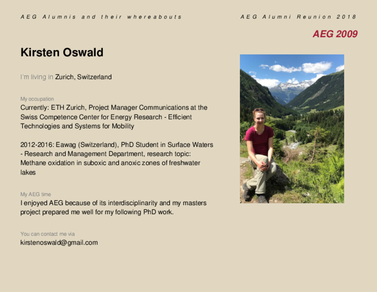 AEG graduates are also well trained for jobs in environmental agencies, non-governmental organizations, and (re-)insurance companies covering costs of environmental risks and remediation. Furthermore, AEG lays an excellent foundation for doctoral studies in programs of earth sciences, environmental sciences, and environmental engineering.
