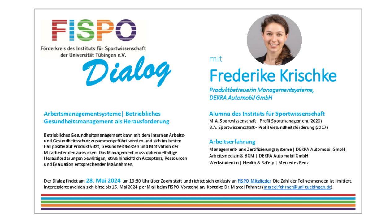 Um interessierten Mitgliedern untereinander einen dialogischen Austausch zu ermöglichen, organisiert FISPO in unregelmäßigen Abständen niederschwellige Gespräche. Diese Dialoge sollen insbesondere mit Alumni der Tübinger Studiengänge geführt werden, wobei die berufstätigen Absolventinnen und Absolventen über ihre aktuelle berufliche Tätigkeit, ihr Berufsfeld und ihren bisherigen Karriereweg informieren, sowie rückblickend ihr Studium am Tübinger Institut reflektieren.