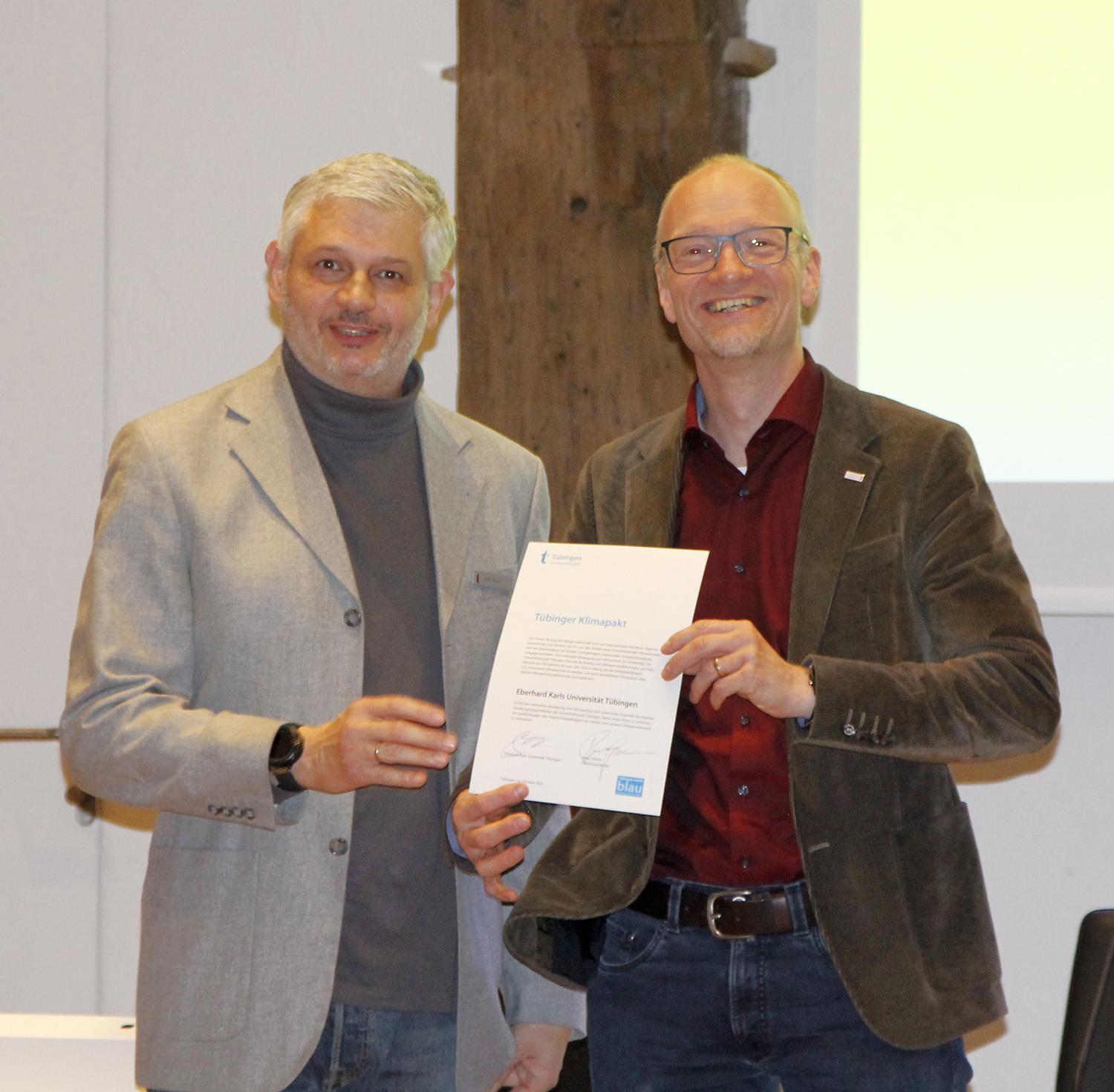 Die Universität Tübingen ist seit diesem Jahr Mitglied im Tübinger Klimapakt. Beim Jahrestreffen des Netzwerks Ende Oktober im Rathaus erhielt Professor Dr. Samuel Wagner, Prorektor für Nachhaltige Entwicklung, die offizielle Urkunde für die Universität. Der Beitritt unterstreicht das langjährige Engagement der Hochschule für nachhaltige Entwicklung und verstärkt die Zusammenarbeit zwischen Stadt, Unternehmen und Institutionen im Kampf gegen den Klimawandel.