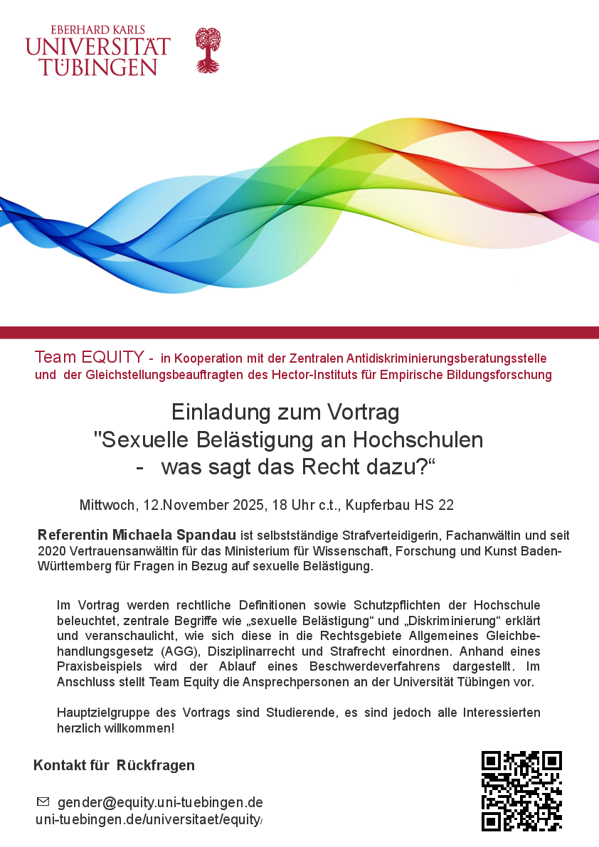 Im Vortrag werden rechtliche Definitionen sowie Schutzpflichten der Hochschule beleuchtet, zentrale Begriffe wie „sexuelle Belästigung“ und „Diskriminierung“ erklärt und veranschaulicht, wie sich diese in die Rechtsgebiete Allgemeines Gleichbehandlungsgesetz (AGG), Disziplinarrecht und Strafrecht einordnen. Anhand eines Praxisbeispiels wird der Ablauf eines Beschwerdeverfahrens dargestellt. Im Anschluss stellt Team Equity die Ansprechpersonen an der Universität Tübingen vor.