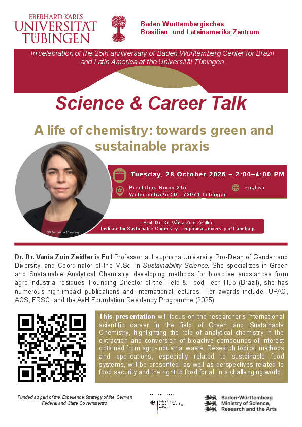 As part of the 25th anniversary celebration of BraLat (Baden-Württemberg Center for Brazil and Latin America at the Universität Tübingen), the lecture Science & Career Talk will be held by Prof. Dr. Dr. Vânia Zuin Zeidler (Institute for Sustainable Chemistry, Leuphana University of Lüneburg).