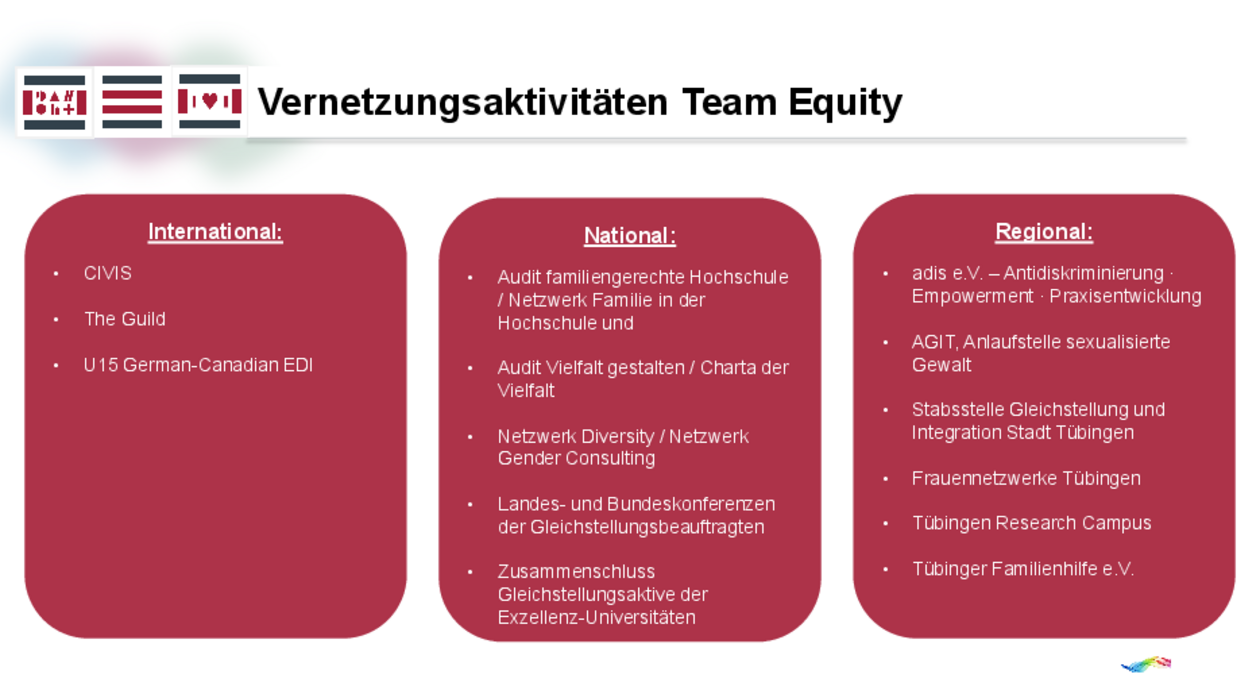 Das Team Equity beteiligt sich an Arbeitsgruppen zu Diversity, Gender und Care innerhalb der universitären Netzwerke und Kooperationen: