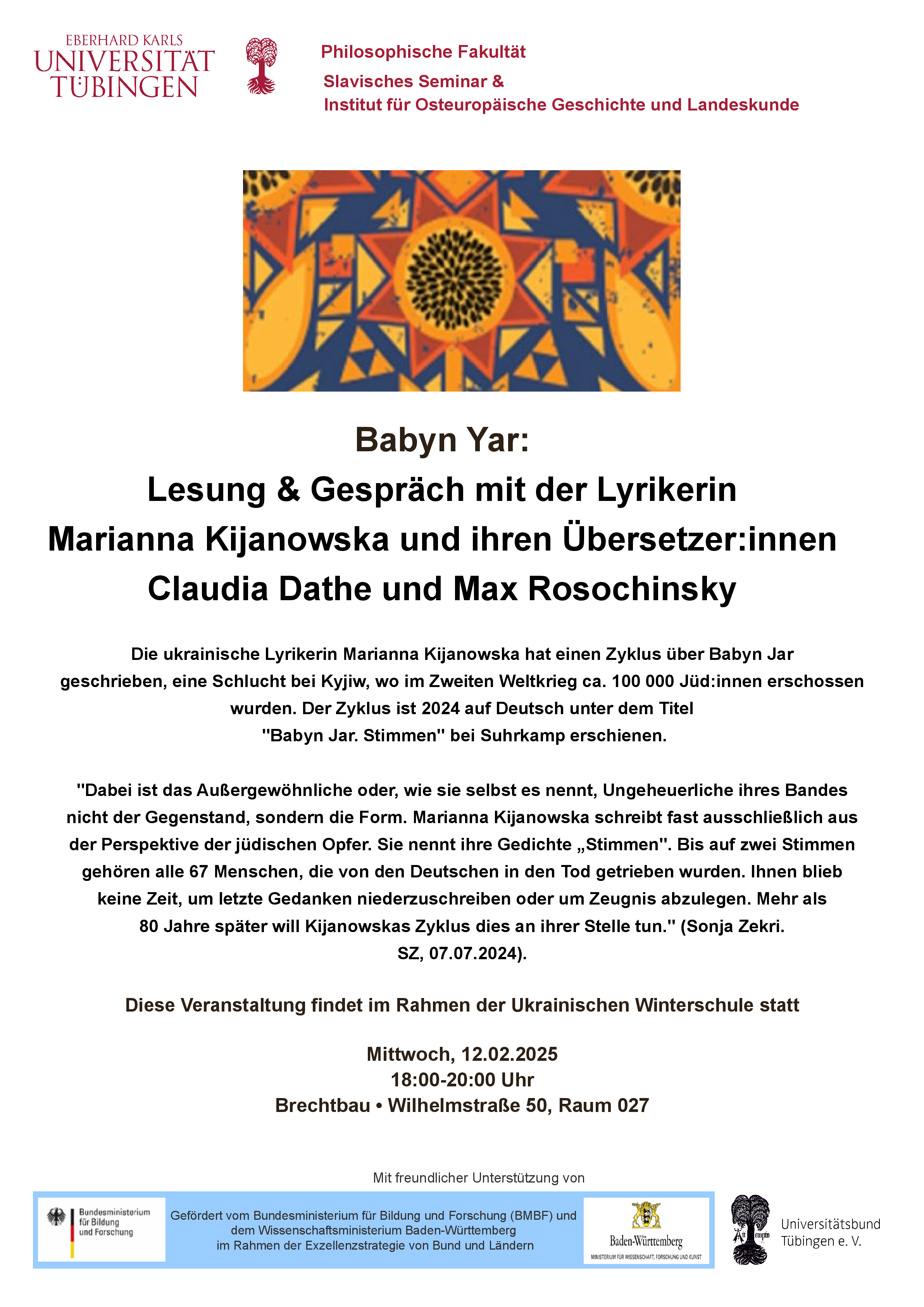 Dank der großzügigen finanziellen Unterstützung und Förderung durch den Universitätsbund Tübingen war es uns möglich, mit unserer Ukrainian Winter School eine herausragende öffentliche Veranstaltung in Tübingen durchzuführen.