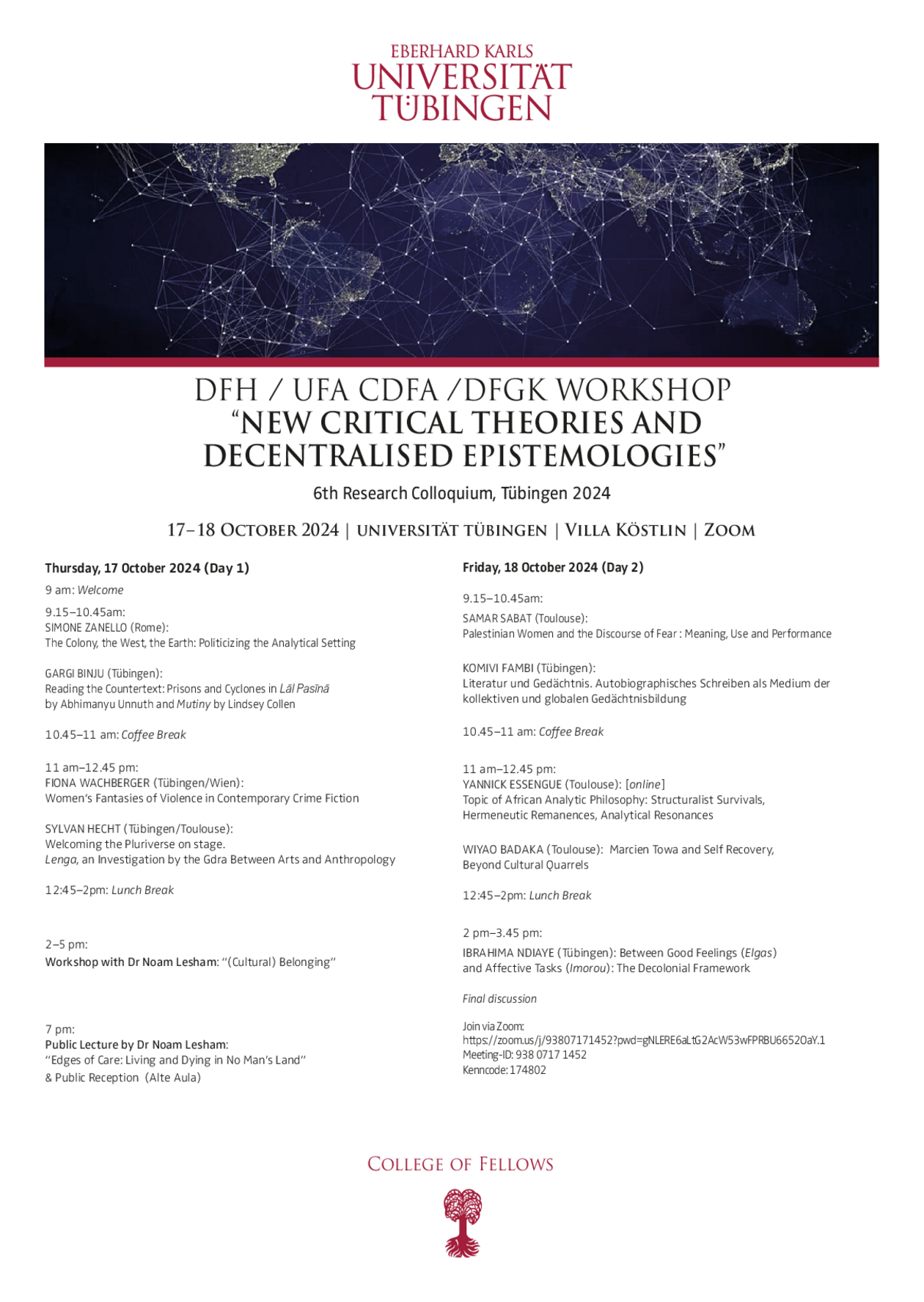 Ort: Universität Tübingen, Villa Köstlin, Seminarraum Datum: Donnerstag, 17., und Freitag, 18. Oktober Workshop mit Doktorandinnen und Doktoranden des DFH-DFGK "Neue kritische Theorien und dezentralisierte Epistemologien". Am Nachmittag des ersten Kolloquiums-Tags sind die Teilnahmenden eingeladen zu einer Workshopsession mit Dr Noam Leshem zum Thema (Cultural) Belonging.