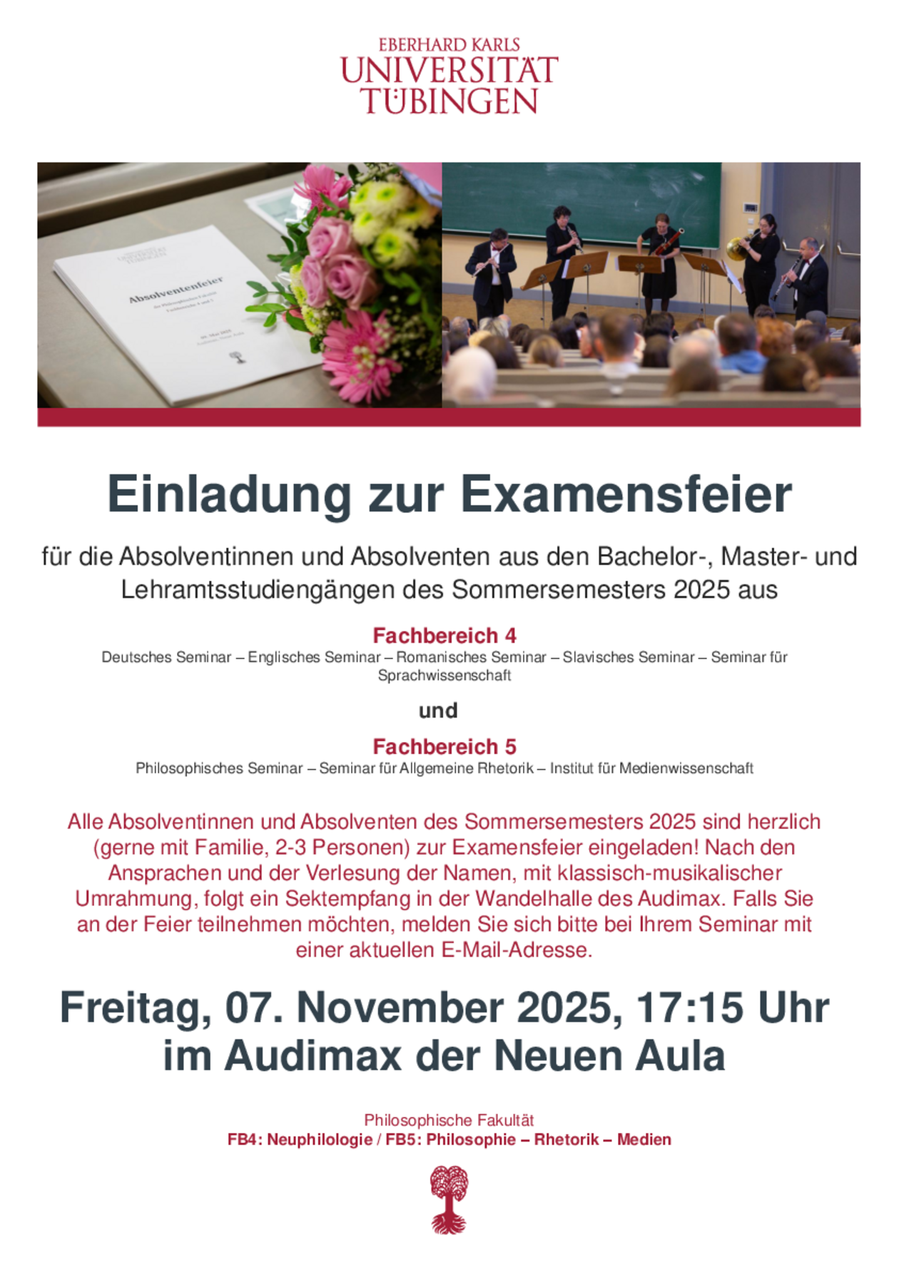 Alle Absolventinnen und Absolventen des Sommersemesters 2025 sind herzlich (gerne mit Familie, 2-3 Personen) zur Examensfeier eingeladen! Nach Ansprachen und der Verlesung der Namen, mit klassisch-musikalischer Umrahmung, folgt ein Sektempfang in der Wandelhalle des Audimax. Falls Sie an der Feier teilnehmen möchten, melden Sie sich bitte bei Ihrem Seminar mit einer aktuellen E-Mail Adresse, damit das Seminar Sie persönlich einladen kann.