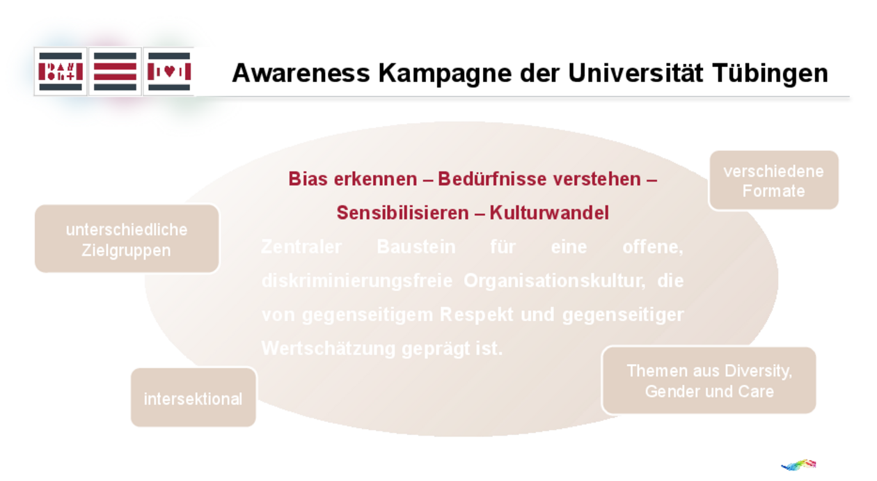 Die Awareness-Kampagne beinhaltet verschiedene Angebotsformate (Vorträge, Fortbildungen, Workshops…) für unterschiedliche Zielgruppen und umfasst die Themenbereiche „Diversity“, „Gender“ und „Care“.